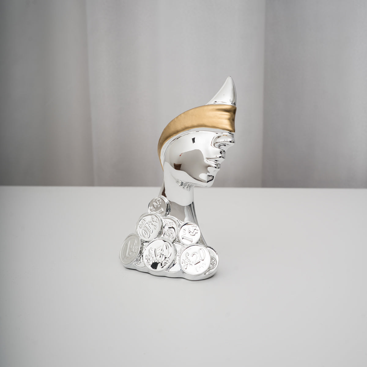 La Dea Bendata con fascia dorata Meridien è una scultura dal design raffinato e contemporaneo, che esprime equilibrio tra eleganza e creatività. Il volto stilizzato, impreziosito dalla fascia dorata, simboleggia la forza, la saggezza e la determinazione, rendendolo un elemento decorativo dal forte valore simbolico.