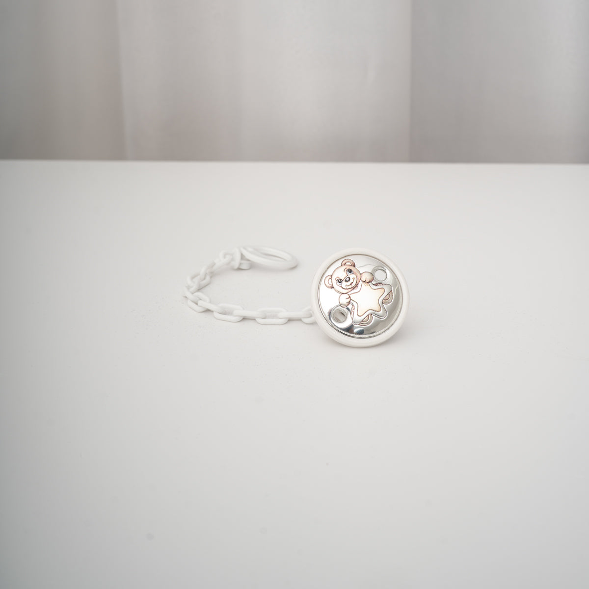 Il portaciuccio orsetto e stellina Meridien è un accessorio elegante e dolce, pensato per accompagnare i primi momenti di vita del bambino con stile e tenerezza. Realizzato con dettagli raffinati nei toni del bianco e dell’argento, è impreziosito da un tenero orsetto e da una piccola stellina, simboli di affetto e protezione.