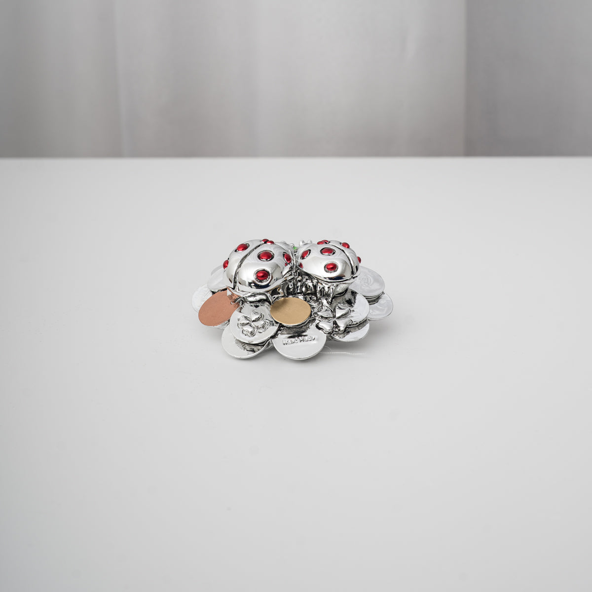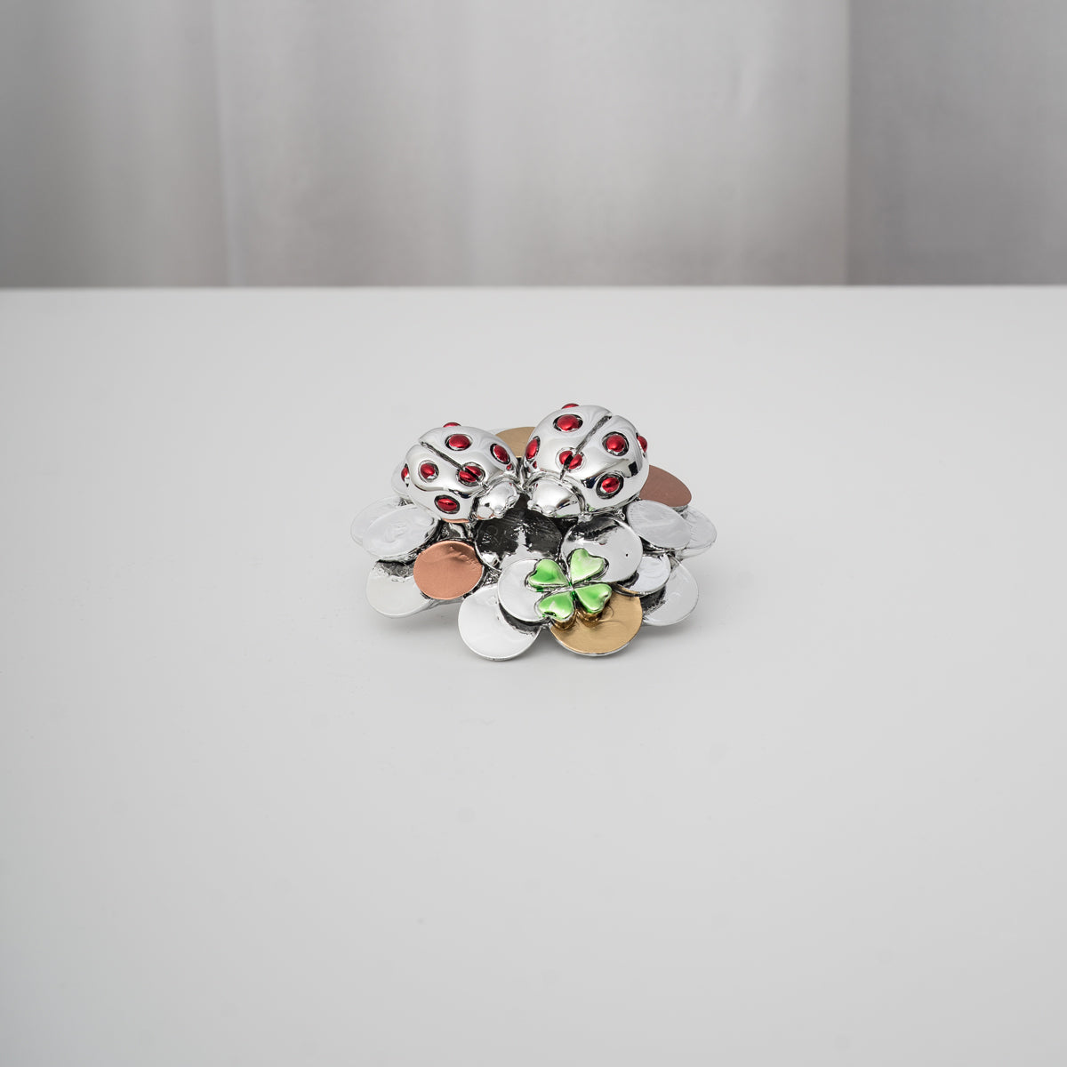 Le due coccinelle, adagiate su un fiore argentato arricchito da un quadrifoglio verde, rappresentano la gioia e l’unione, rendendo questo oggetto ideale come idea regalo portafortuna o complemento d’arredo elegante per la casa e l’ufficio.