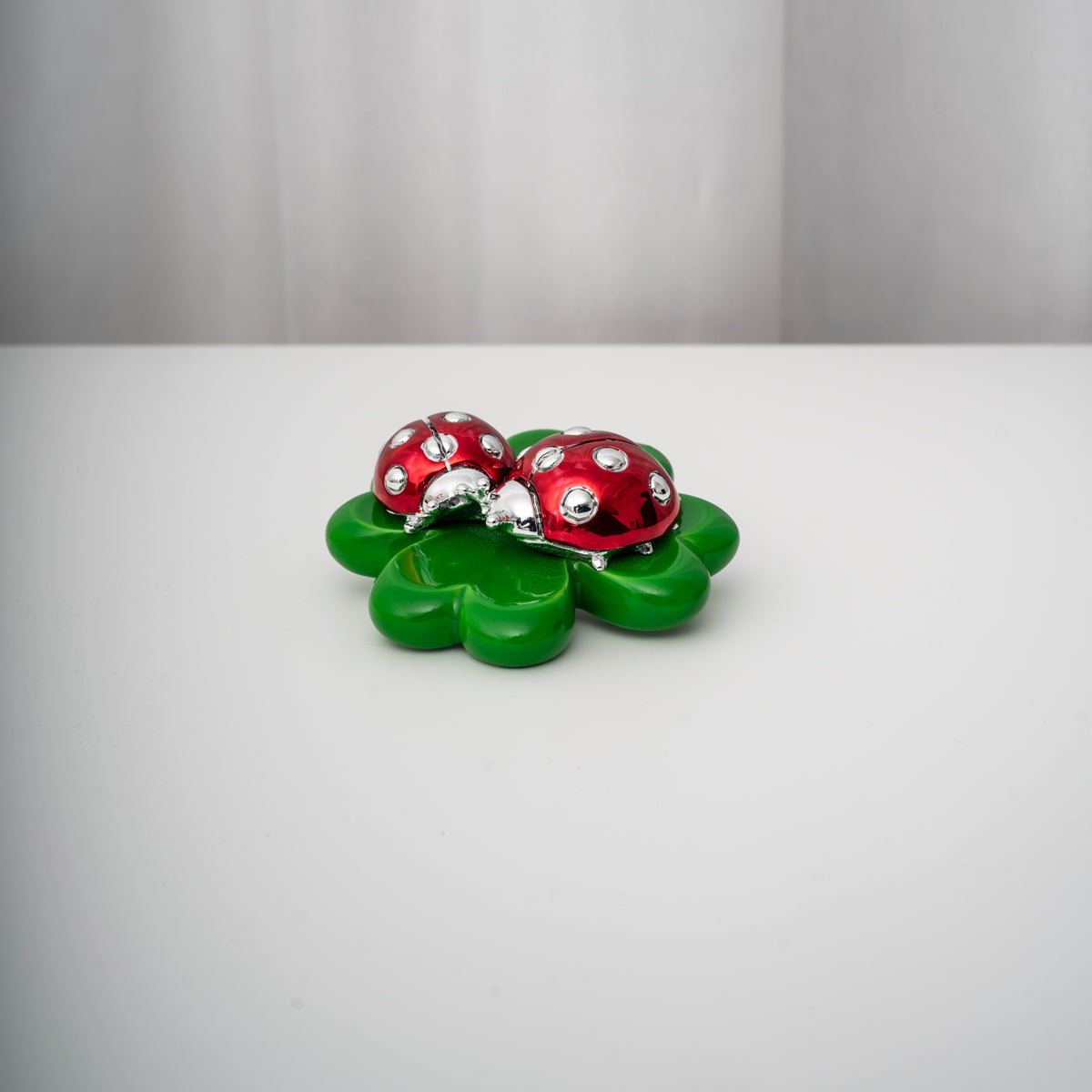 Le due coccinelle, adagiate su un quadrifoglio verde, rappresentano unione e buon auspicio, rendendo questa scultura perfetta come idea regalo portafortuna o come decorazione elegante per la casa o l’ufficio. Fa parte della collezione Meridien, nota per la cura dei dettagli e la qualità artigianale delle sue creazioni.