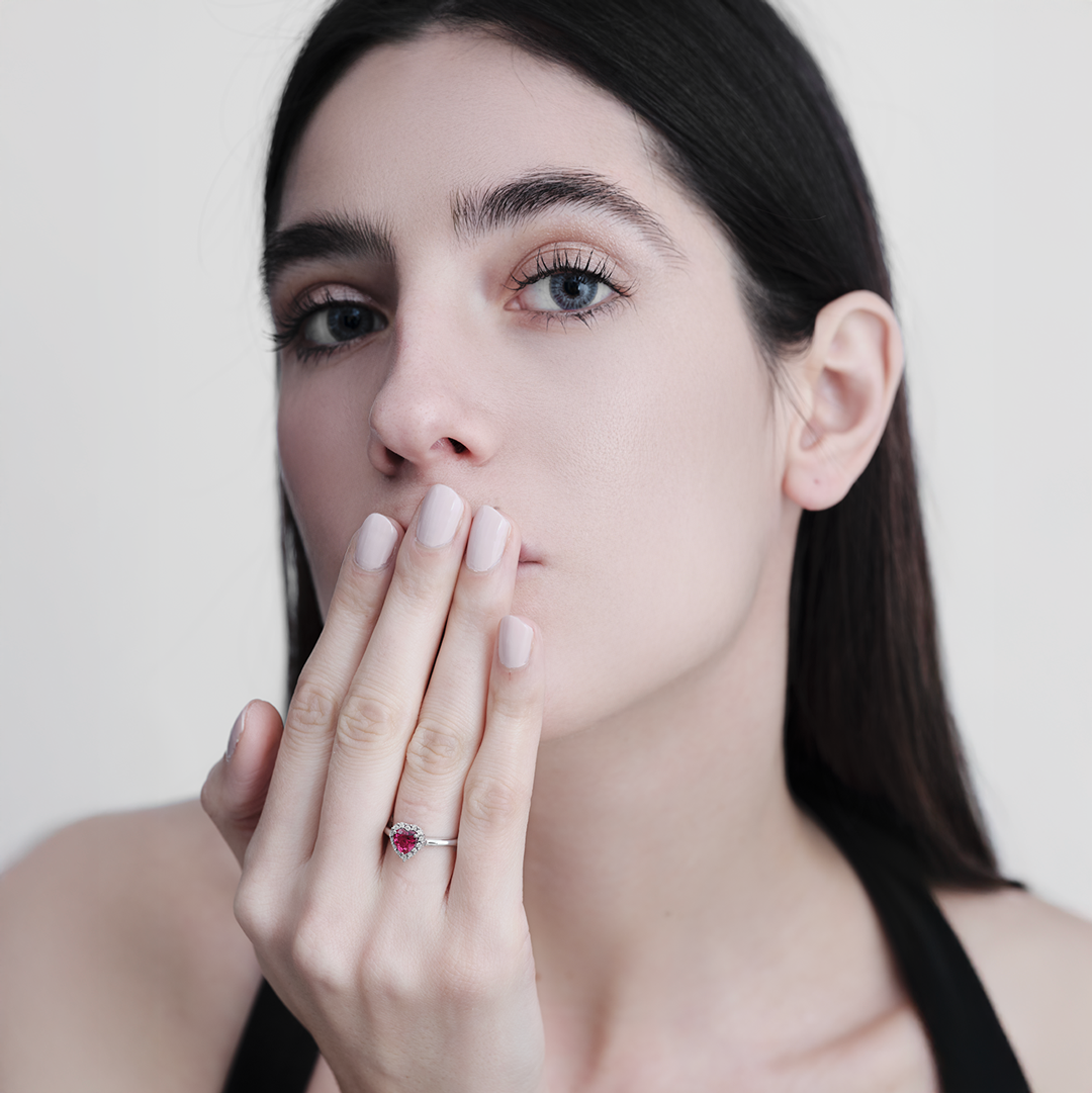 L’Anello Gemmarara in oro bianco 9kt è un gioiello elegante e intenso, pensato per chi ama uno stile romantico ma deciso. Al centro spicca una pietra di sintesi rossa, taglio cuore da 0,95 kt, luminosa e simbolica, scelta per rappresentare amore, emozione e femminilità con una presenza raffinata.