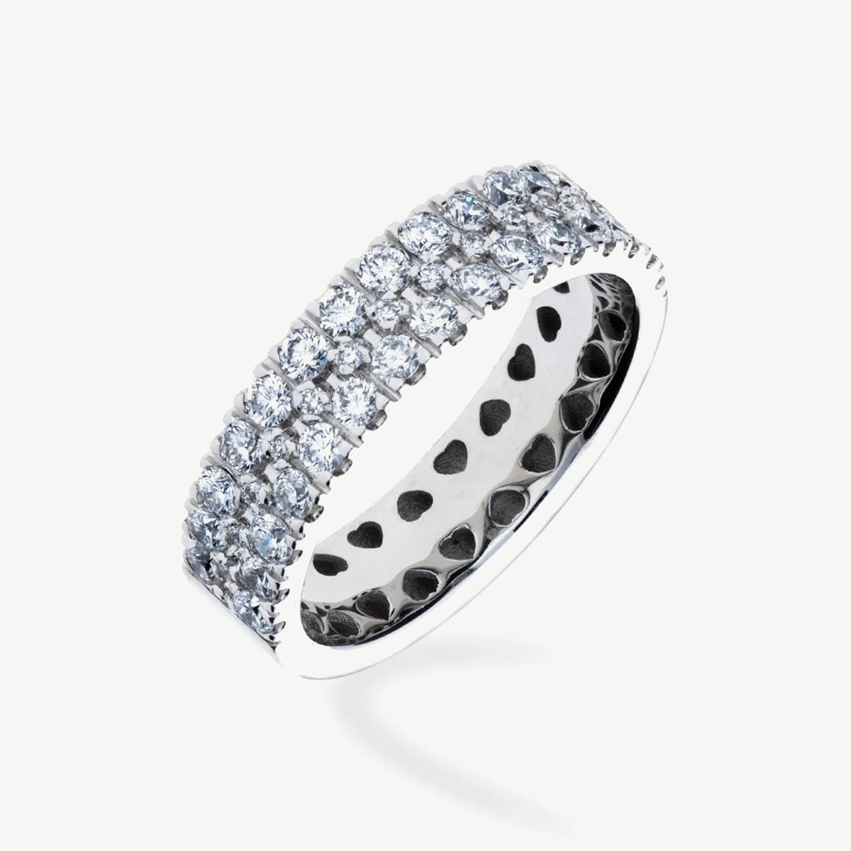 Raffinato ed elegante, questo anello pavé in oro bianco 18 kt è impreziosito da tre file di diamanti naturali taglio brillante, per un totale di 1,05 carati. La montatura a pavé valorizza ogni pietra, creando un effetto di luce continuo e scintillante che cattura lo sguardo da ogni angolazione.