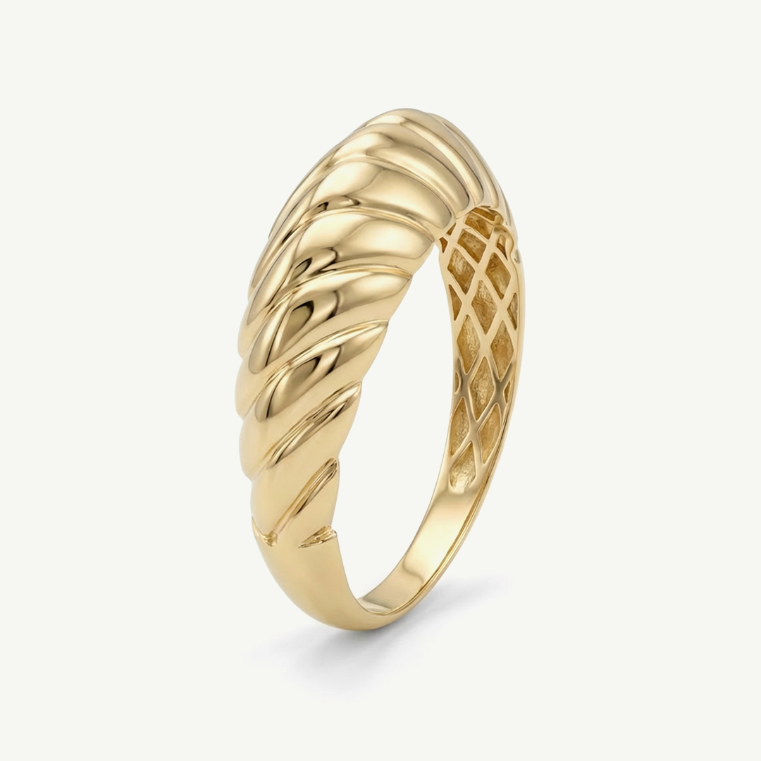 La lavorazione intrecciata dona carattere e profondità al gioiello, mantenendo al tempo stesso un’eleganza equilibrata e versatile. La struttura interna è studiata per garantire comfort e vestibilità, rendendo questo anello in oro giallo 9kt Fabiani Gioiellerie ideale sia per l’uso quotidiano che per occasioni speciali.