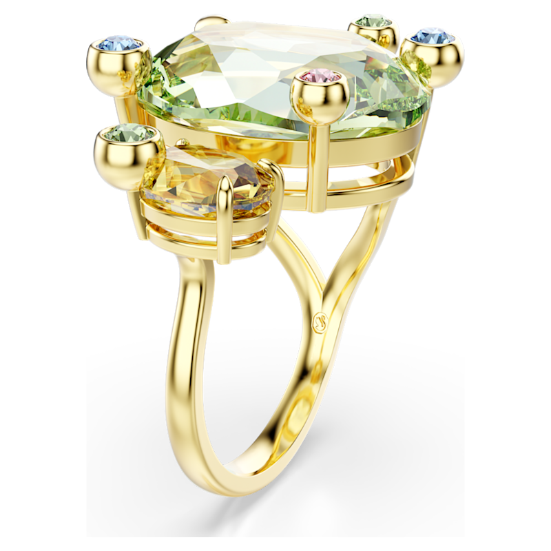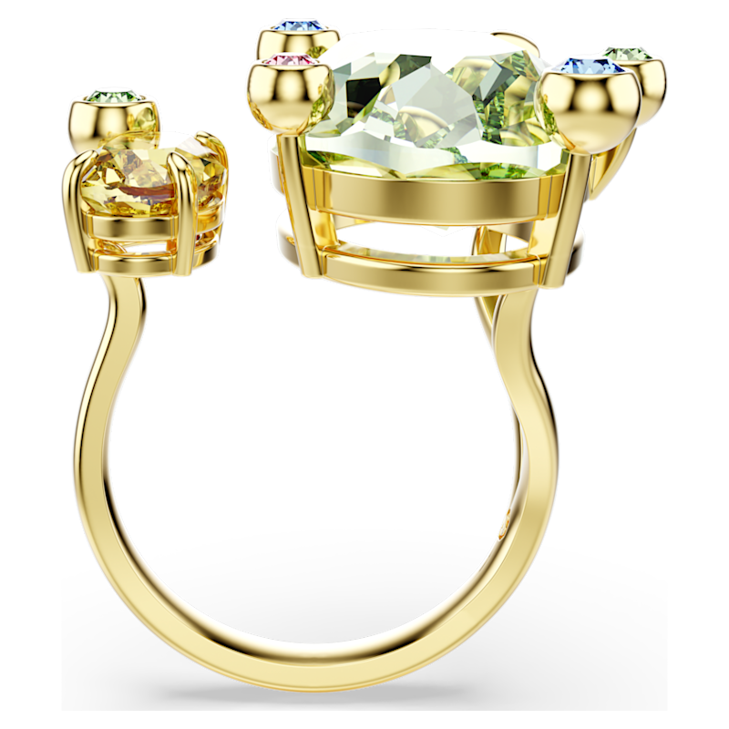 Lo spirito eclettico della famiglia Gema prende vita con gioia in questo anello aperto a fascia. Il design placcato in tonalità oro presenta due cristalli principali in verde e giallo, circondati da cristalli multicolori più piccoli in una montatura a griffe a bolle. Un look effervescente per i giorni in cui vuoi che il tuo stile abbia un tocco pop.