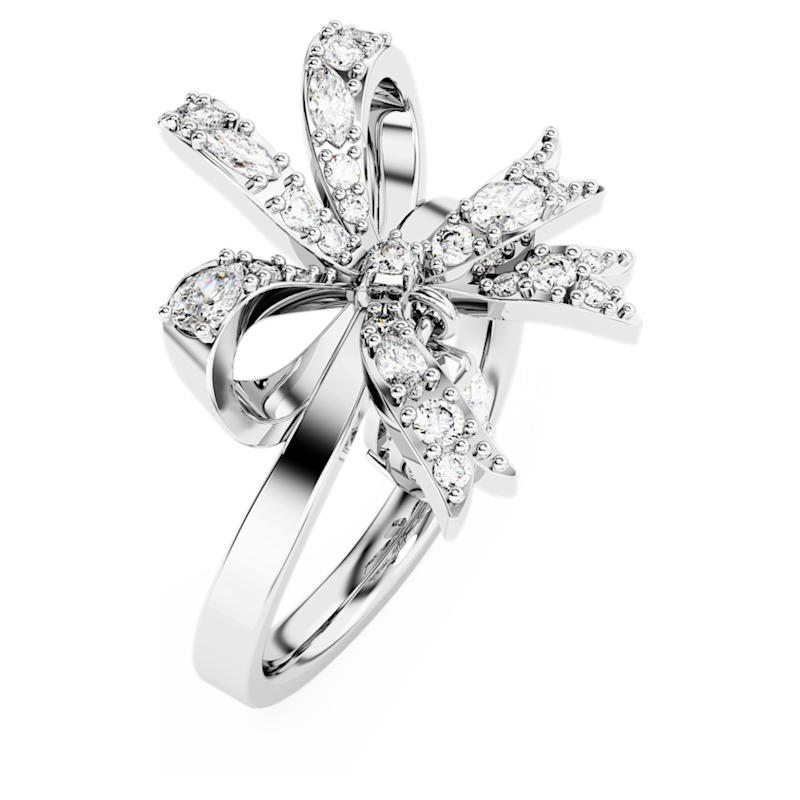 Indossare questo originale anello cocktail Hyperbola è come mettere un nastro attorno al dito: ti sembrerà di ricevere un regalo ogni volta che lo infili. Il design ispirato al fiocco è placcato rodio e presenta una serie di frizzanti cristalli Cry montati utilizzando la tecnica dello chattonage. Due delicate pietre aggiungono ulteriore fascino a questo gioiello, una rotonda al centro del fiocco, l'altra a forma di pera sospesa sotto la prima. Indossa questo anello per un tocco di eleganza moderna oppure sceglilo come regalo romantico ideale.