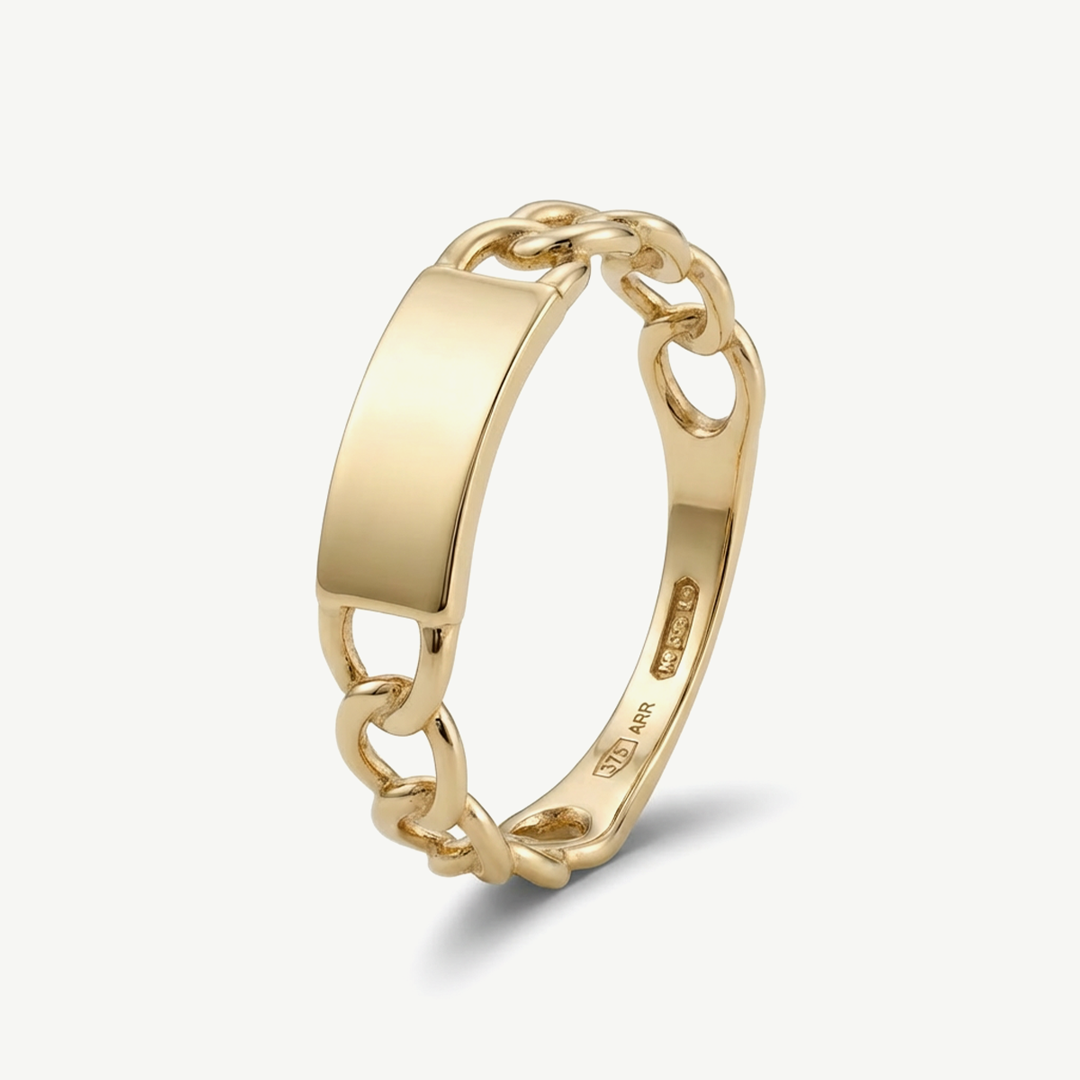 L’Anello Fabiani a catena è realizzato in oro giallo 9kt e si distingue per il suo design contemporaneo ed essenziale. La struttura richiama una catena compatta, arricchita da una piastrina liscia centrale che dona carattere e pulizia formale al gioiello.