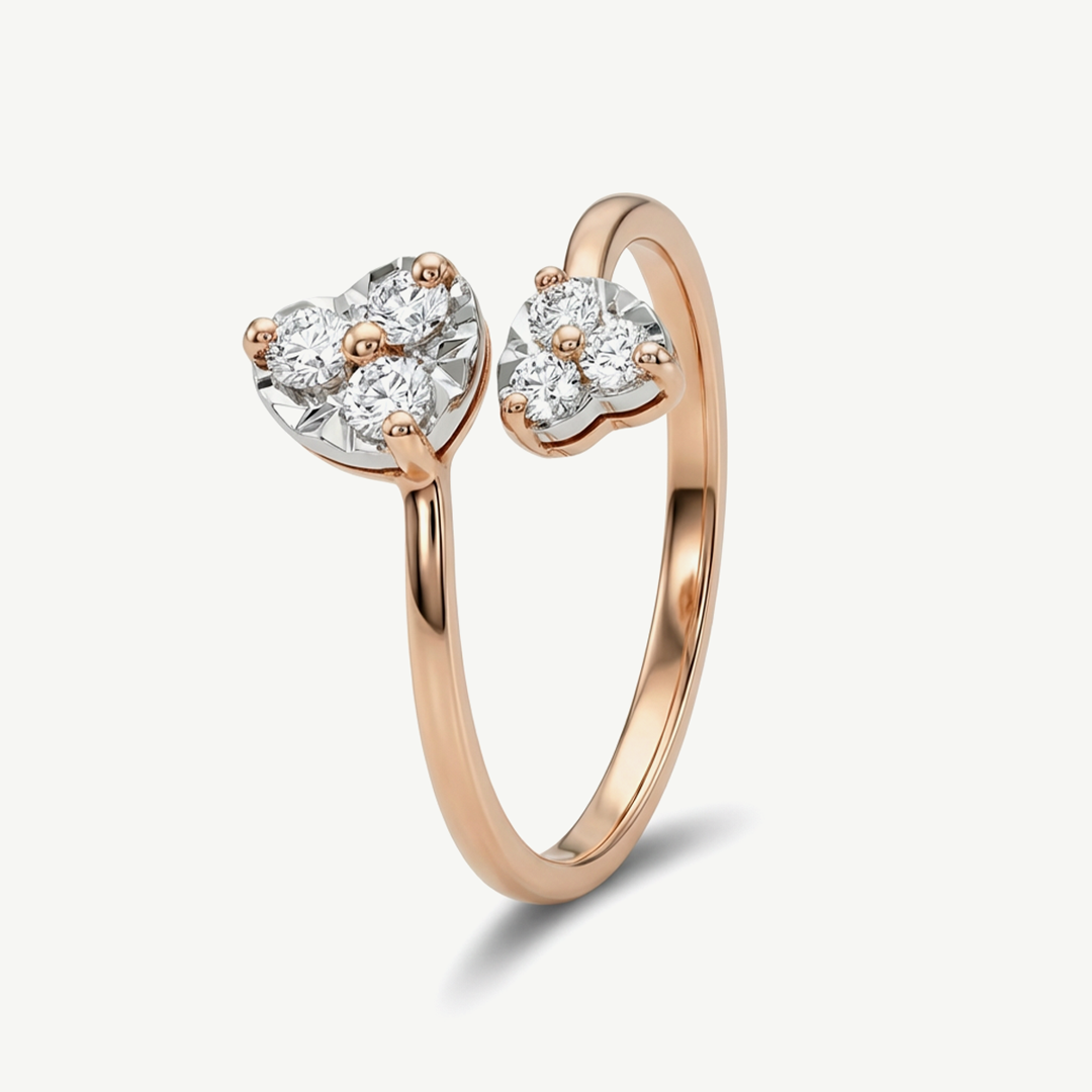 L’Anello Fabiani contrarié è un gioiello elegante e raffinato, realizzato in oro rosa 18kt. Il design aperto valorizza due teste contrapposte, ognuna impreziosita da un delicato pavé di diamanti per un totale di 0,27 ct, creando un equilibrio armonioso tra luce, forma e movimento.