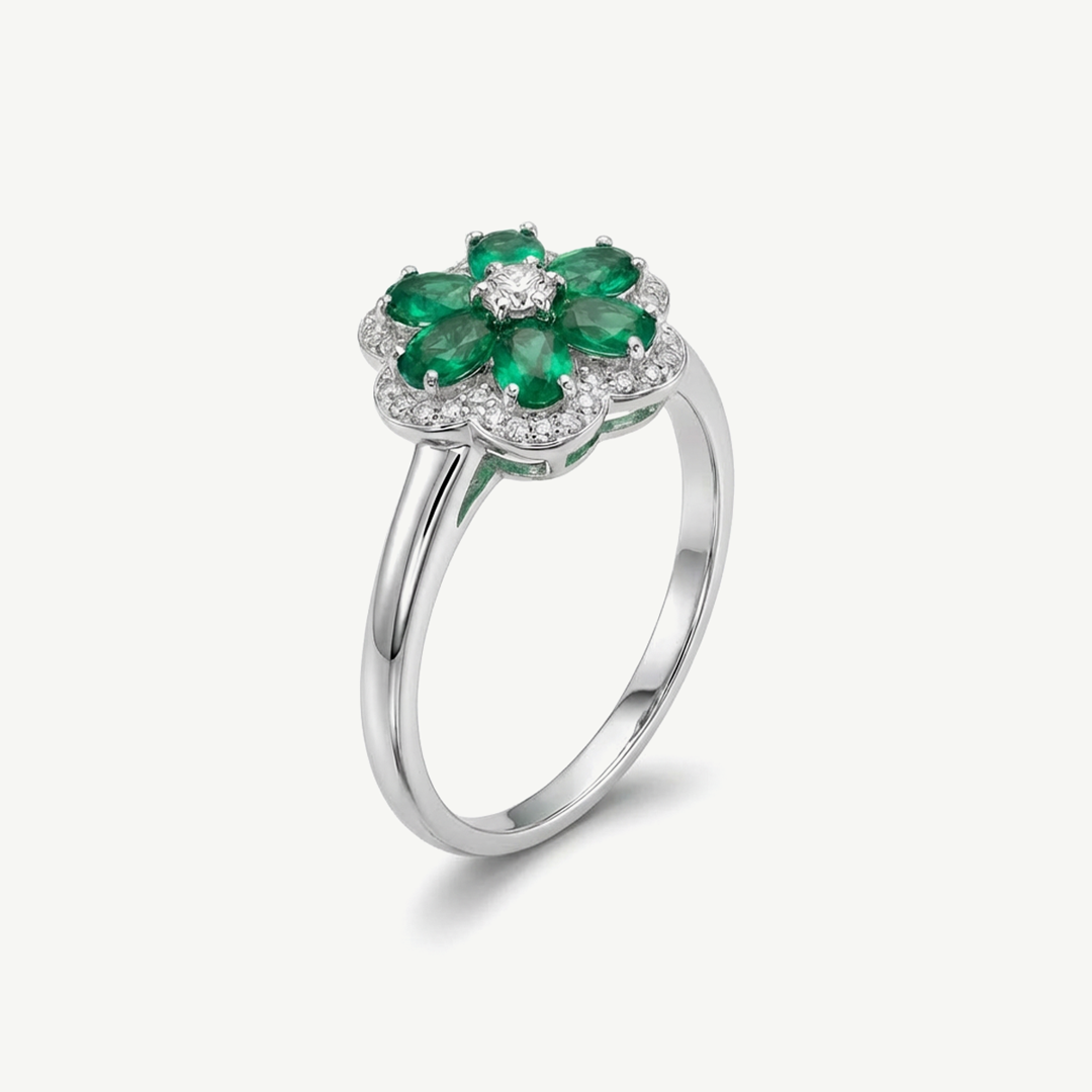 Gli smeraldi, intensi e profondi nel loro verde naturale, sono disposti a formare un delicato motivo a fiore che richiama armonia, eleganza e rinascita. Il diamante centrale e il pavé di diamanti che circonda la composizione amplificano la luce e donano equilibrio e preziosità al design. La montatura in oro bianco 18 carati esalta il contrasto cromatico tra le gemme e garantisce una resa raffinata e contemporanea.
