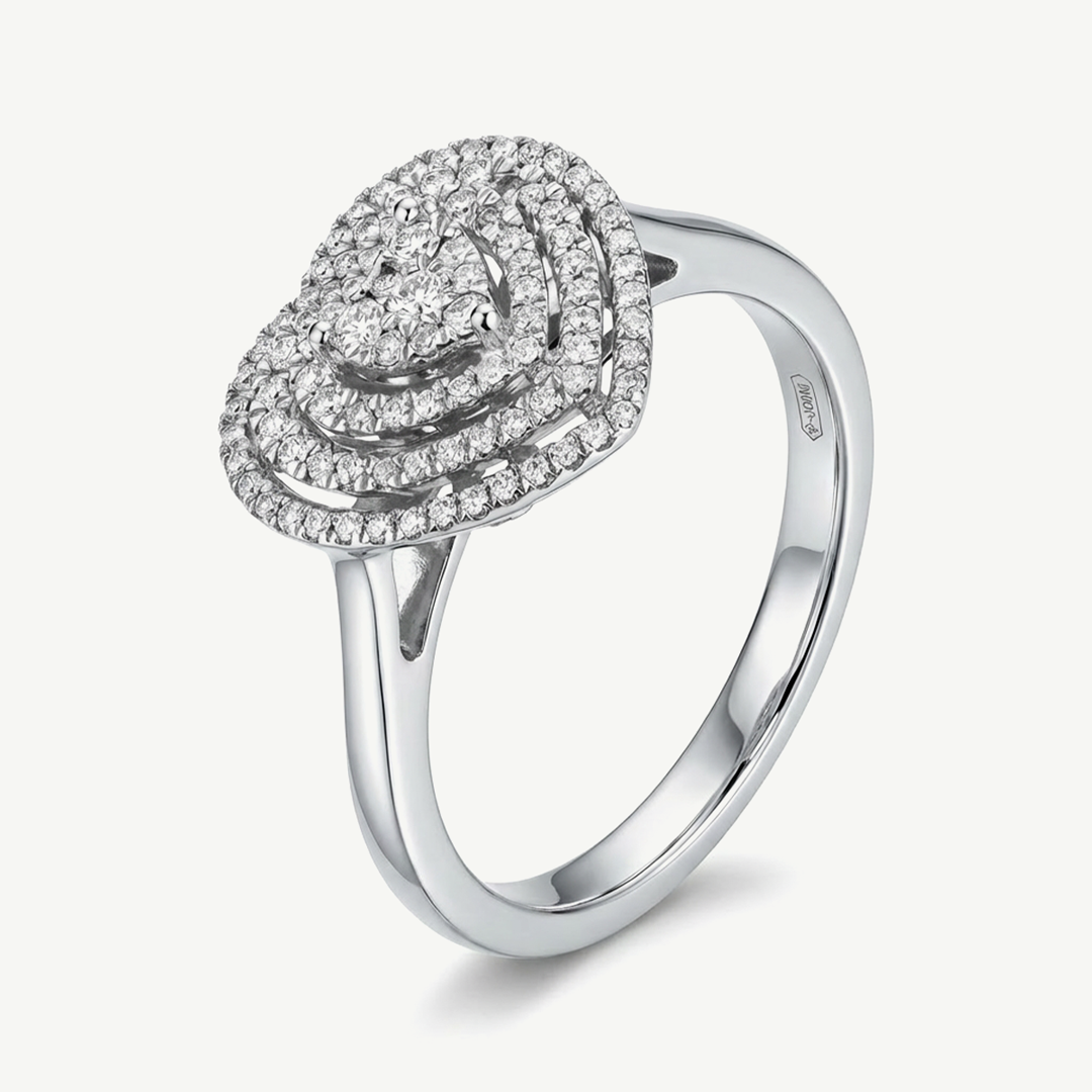 L’anello Fabiani Gioiellerie a cuore è realizzato in oro bianco 18kt ed è impreziosito da una raffinata composizione di diamanti per un totale di 0,36 ct.