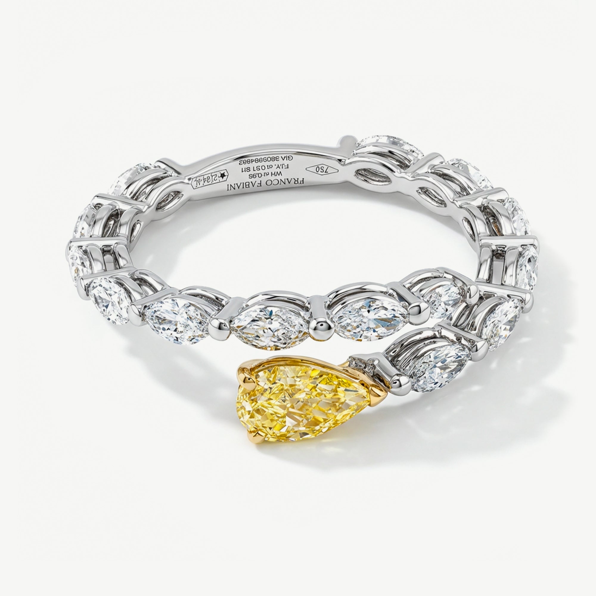 La composizione alterna tagli navette e goccia, disegnando un movimento fluido e armonico che avvolge il dito come un raggio che non conosce fine. Al centro, la pietra Fancy da 0,51 ct, certificata GIA, esprime un colore Giallo Intenso di rara profondità, con purezza SI1: una scintilla viva, calda, irripetibile.