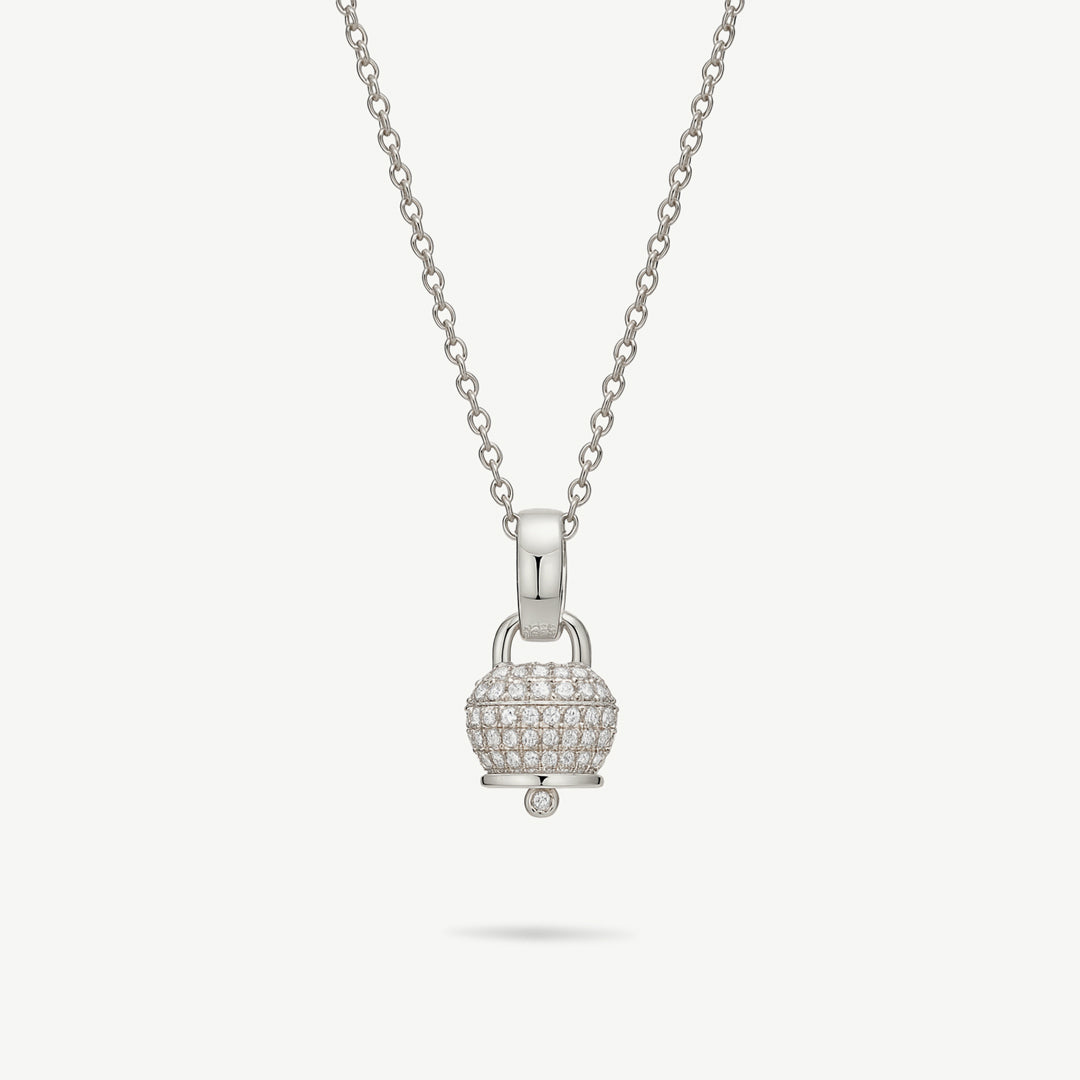 Raffinata e simbolica, questa collana in argento 925 presenta un elegante ciondolo a forma di campanella interamente ricoperto di zirconi bianchi pavé, per un effetto luminoso e prezioso.