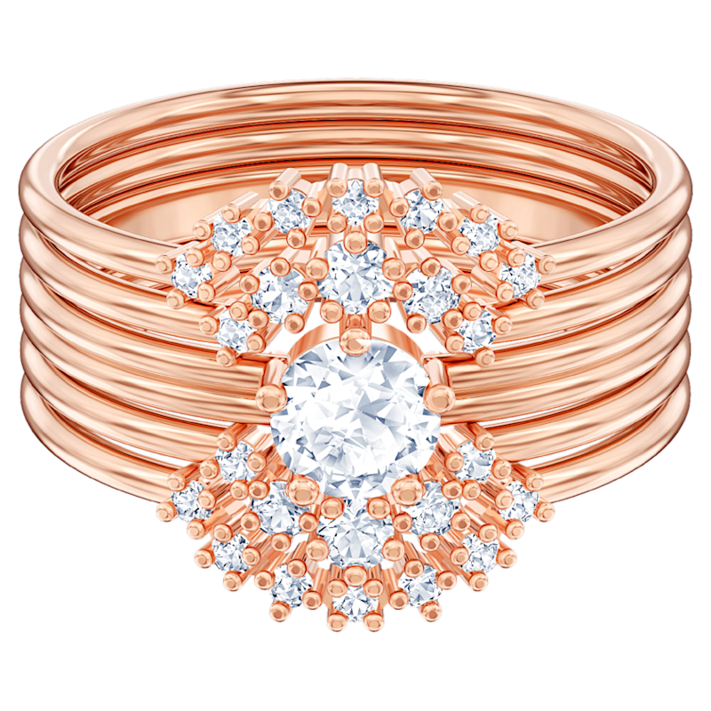 La celestiale collezione MoonSun celebra la magia del cielo notturno. Placcato nella tonalità oro rosa, questo anello a sei fasce di grande stile è decorato con gruppi di delicati cristalli bianchi con incastonatura a griffe, scintillanti come le stelle, e presenta un grande elemento di cristallo centrale. Un design moderno e versatile, puoi riordinare gli anelli come desideri per creare look differenti o indossarli su dita diverse. Ricchi di maestria artigianale Swarovski, sono un dettaglio perfetto da indossare dal giorno alla sera.