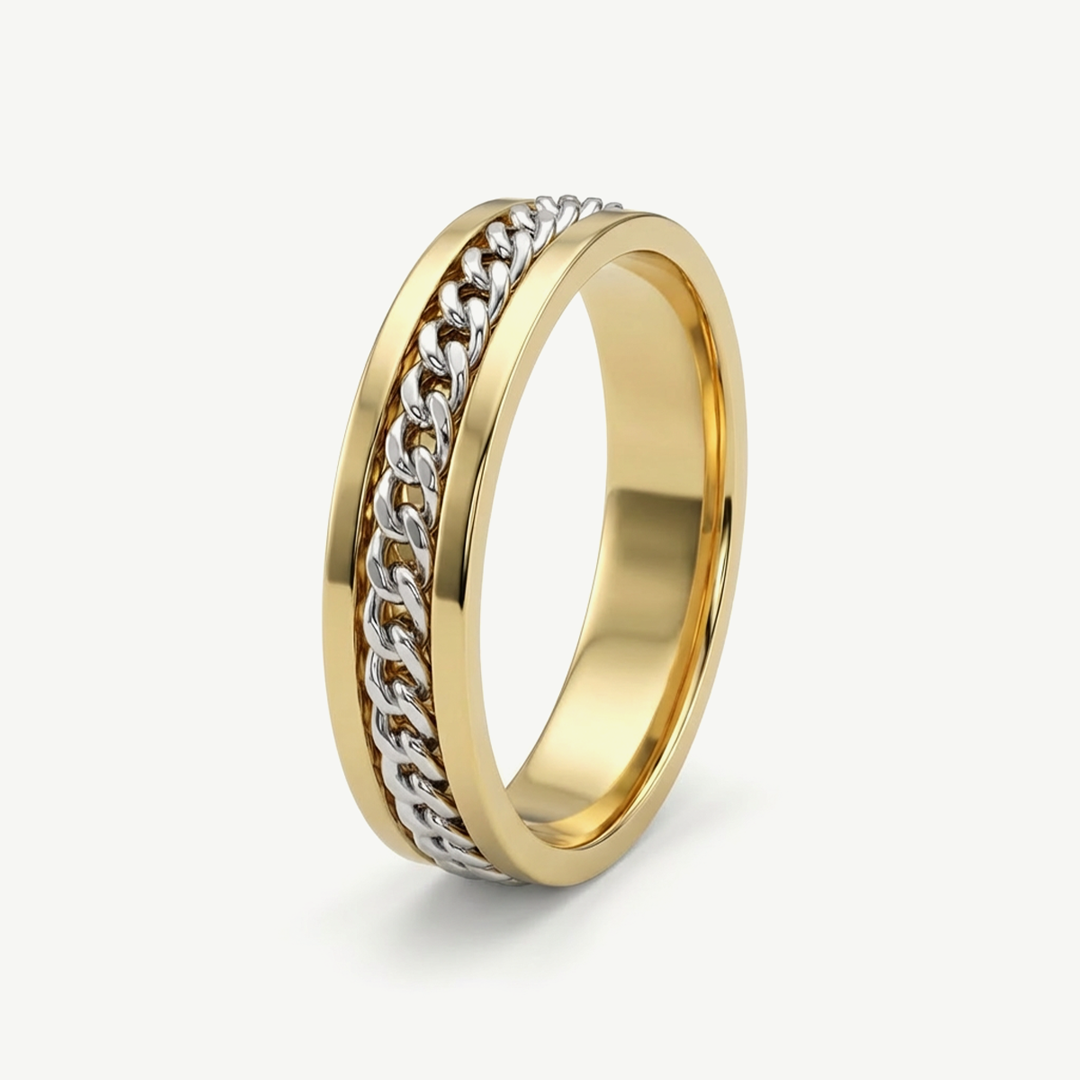 Il motivo a catena, simbolo di forza e continuità, conferisce personalità all’anello, mentre le superfici lisce e lucide dell’oro giallo garantiscono comfort, solidità e una vestibilità impeccabile. Un equilibrio perfetto tra stile classico e gusto moderno, pensato per chi ama dettagli distintivi ma mai eccessivi.