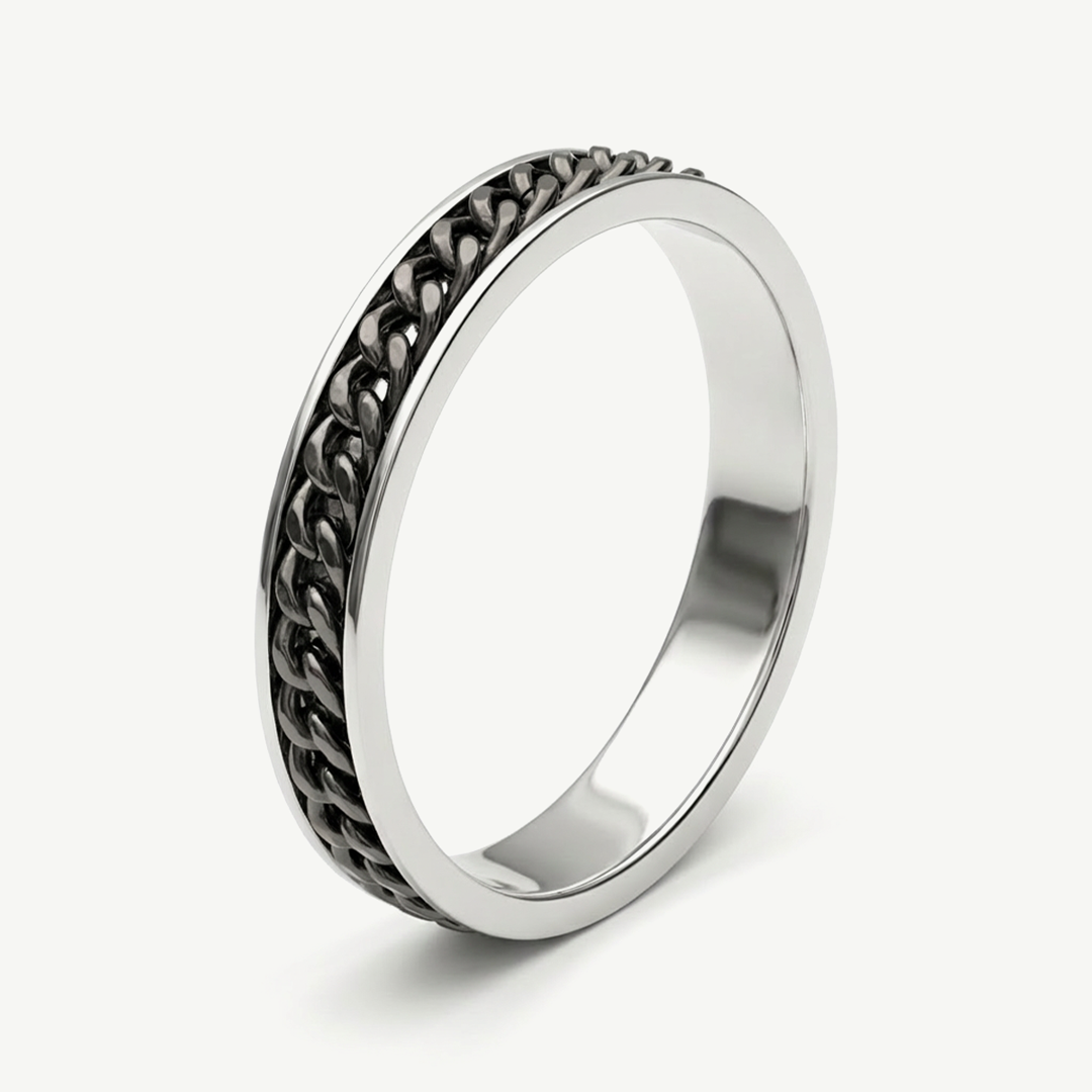 La lavorazione della catena, dal finish scuro e sofisticato, dona movimento e un tocco urban all’anello, mentre il profilo pulito dell’argento garantisce comfort, solidità e una vestibilità perfetta. Un gioiello essenziale ma distintivo, capace di adattarsi sia a look quotidiani sia ad abbinamenti più ricercati.