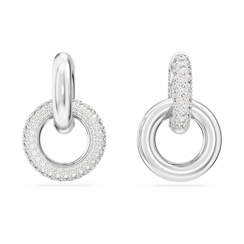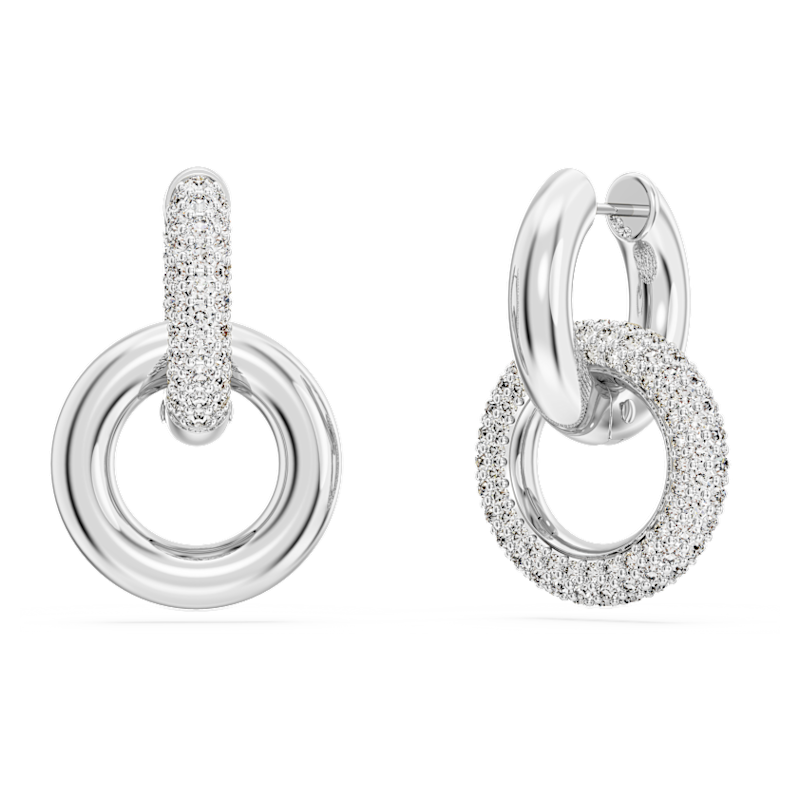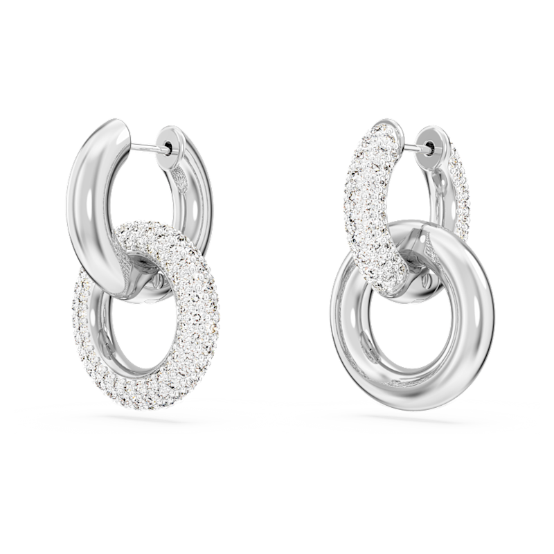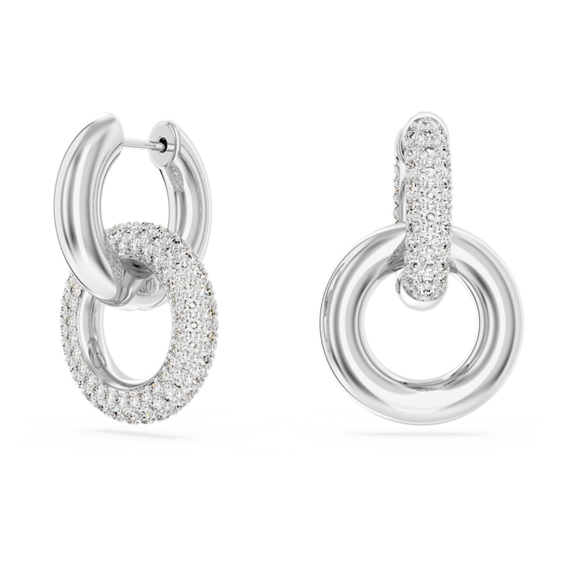 Questi orecchini a cerchio intrecciati della famiglia Dextera presentano due anelli tubolari placcati rodio, di cui uno impreziosito da pavé all-over. Per un ulteriore tocco asimmetrico, gli anelli sono disposti in modo diverso su ciascun gioiello. Inoltre, è anche possibile rimuovere il secondo cerchio per uno stile a cerchio singolo che offre una maggiore versatilità.