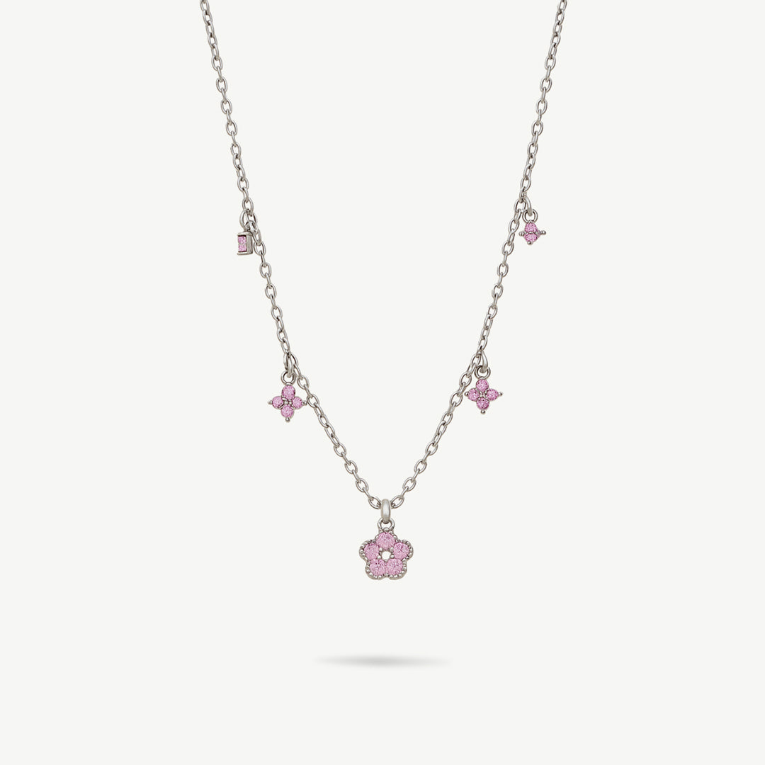 Una collana in argento con fiore e zirconi rosa che unisce romanticismo e raffinatezza, ideale per completare ogni look con eleganza discreta.