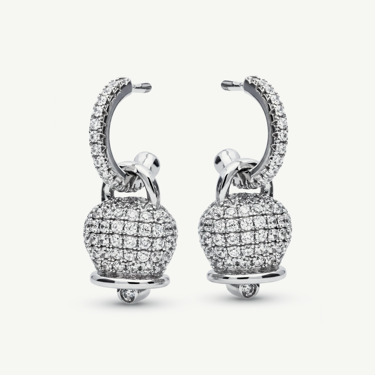 Eleganti e luminosi, questi orecchini a cerchio in argento rodiato presentano un charm a campanello ricoperto da pavé di zirconi bianchi. Il design sofisticato unisce la brillantezza dei dettagli con una forma moderna e raffinata, perfetta per impreziosire ogni look.