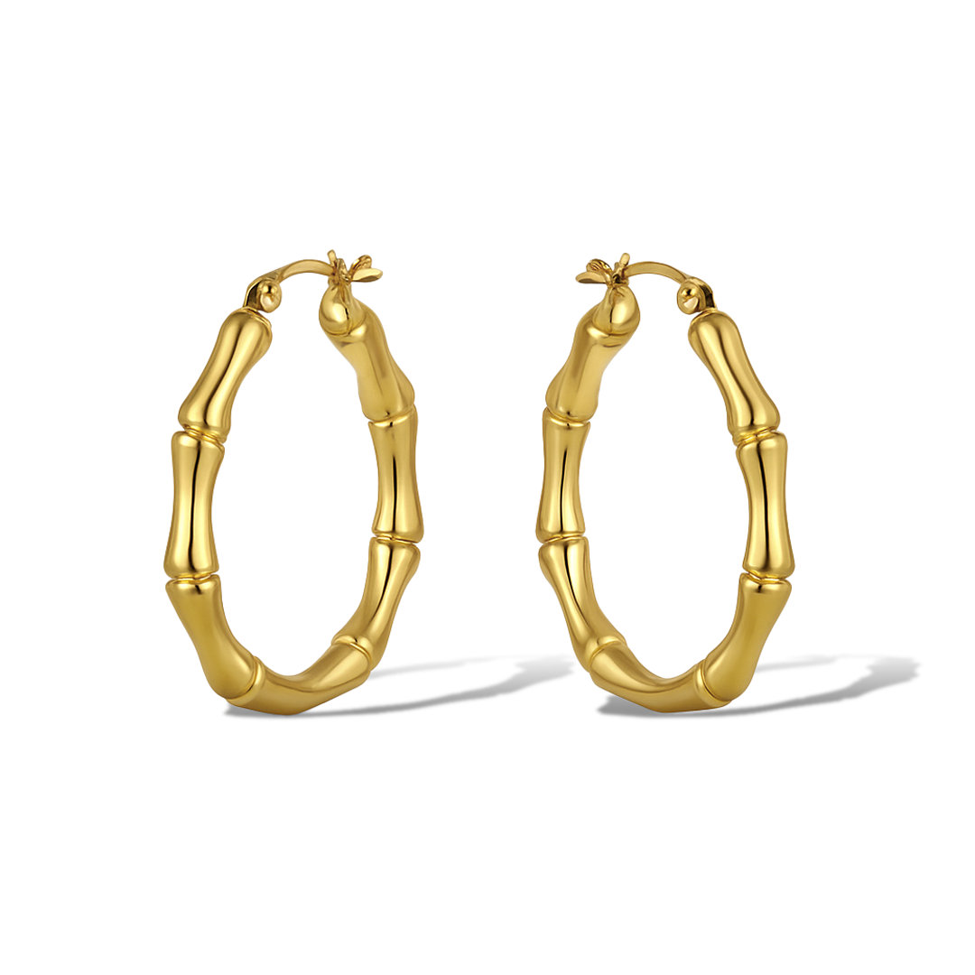 Orecchini a cerchio bombato tipo bamboo in oro giallo 14Kt. Diametro 3,7 cm circa e chiusura a scatto.