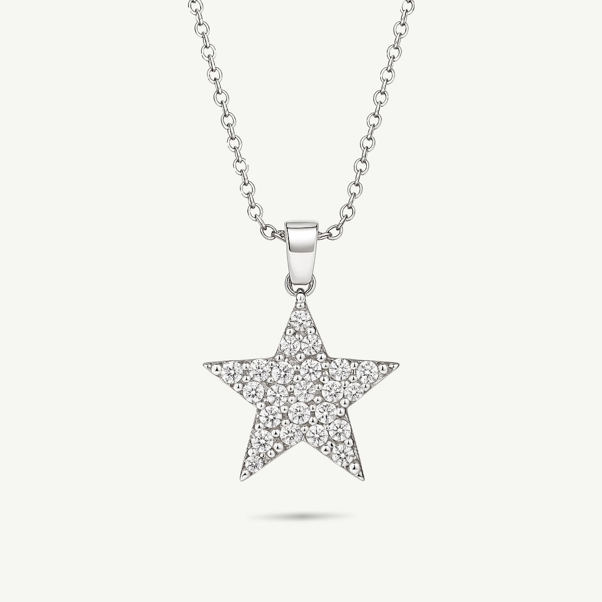 La collana Fabiani in oro bianco 9Kt con pendente a stella è un gioiello luminoso e raffinato, impreziosito da zirconi taglio brillante che ne esaltano la luce ad ogni movimento. La catenina a maglia rolò, lunga circa 45 cm, con chiusura a moschettone, garantisce comfort e resistenza, rendendola perfetta per l’uso quotidiano o per occasioni speciali.