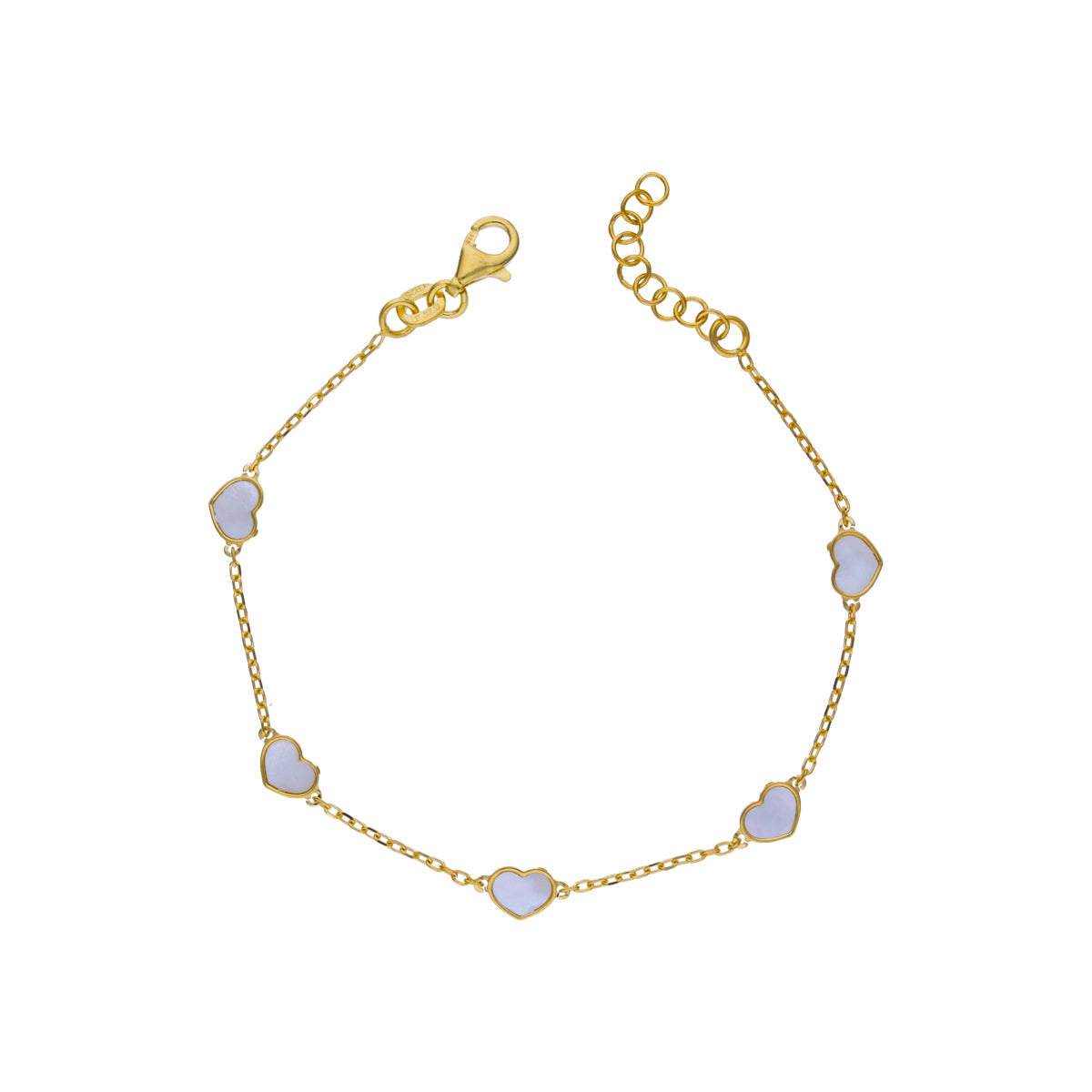 Questo bracciale bimbo in argento 925 dorato è un gioiello delicato e raffinato, perfetto per un pensiero speciale. Decorato con 5 cuori smaltati in bianco madreperla, ognuno di circa 6 mm, trasmette dolcezza e leggerezza, simbolo di amore e calore.