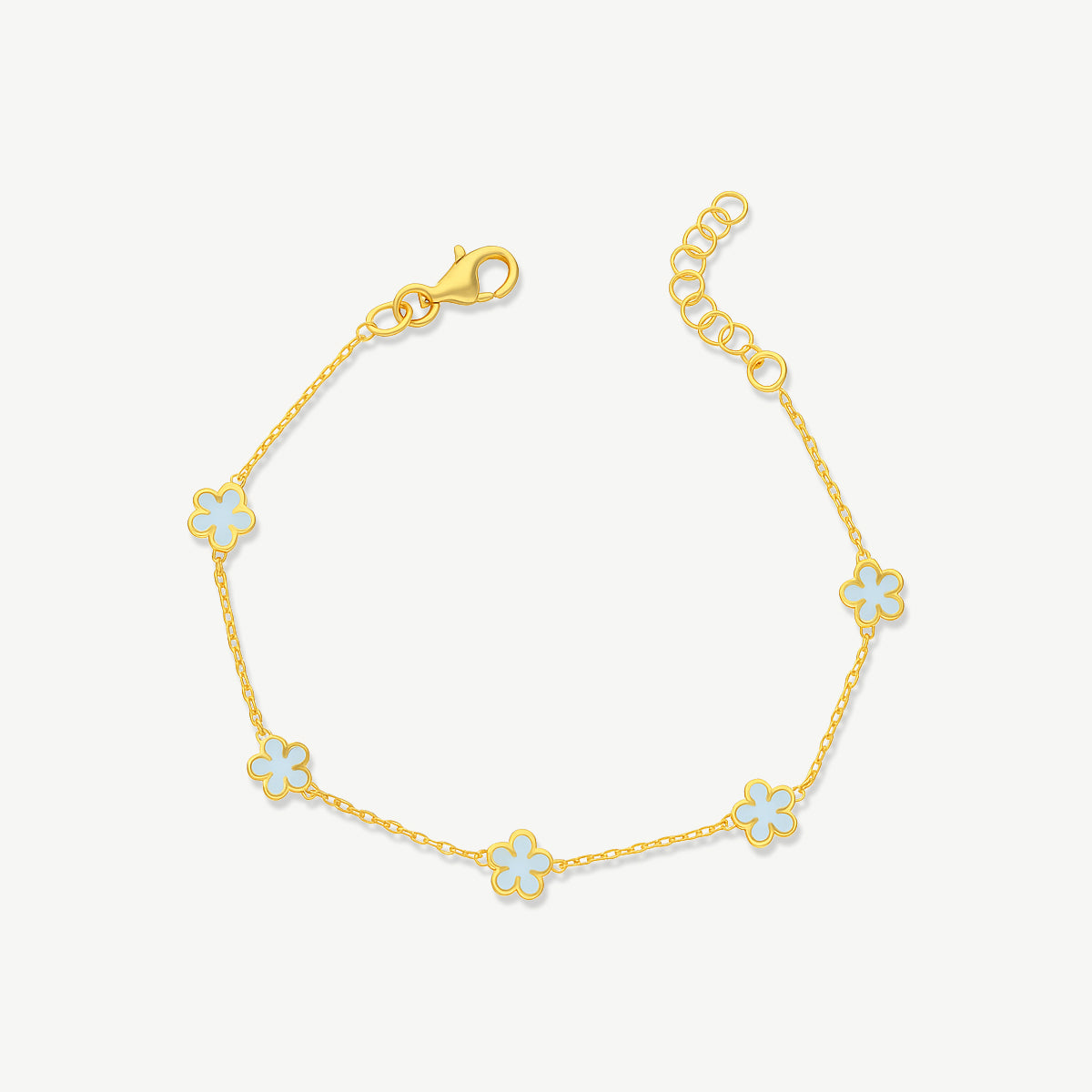 Il bracciale Fabiani in argento 925 dorato è impreziosito da cinque delicati fiori smaltati di un elegante azzurro chiaro, che aggiungono un tocco fresco e raffinato al design minimal.