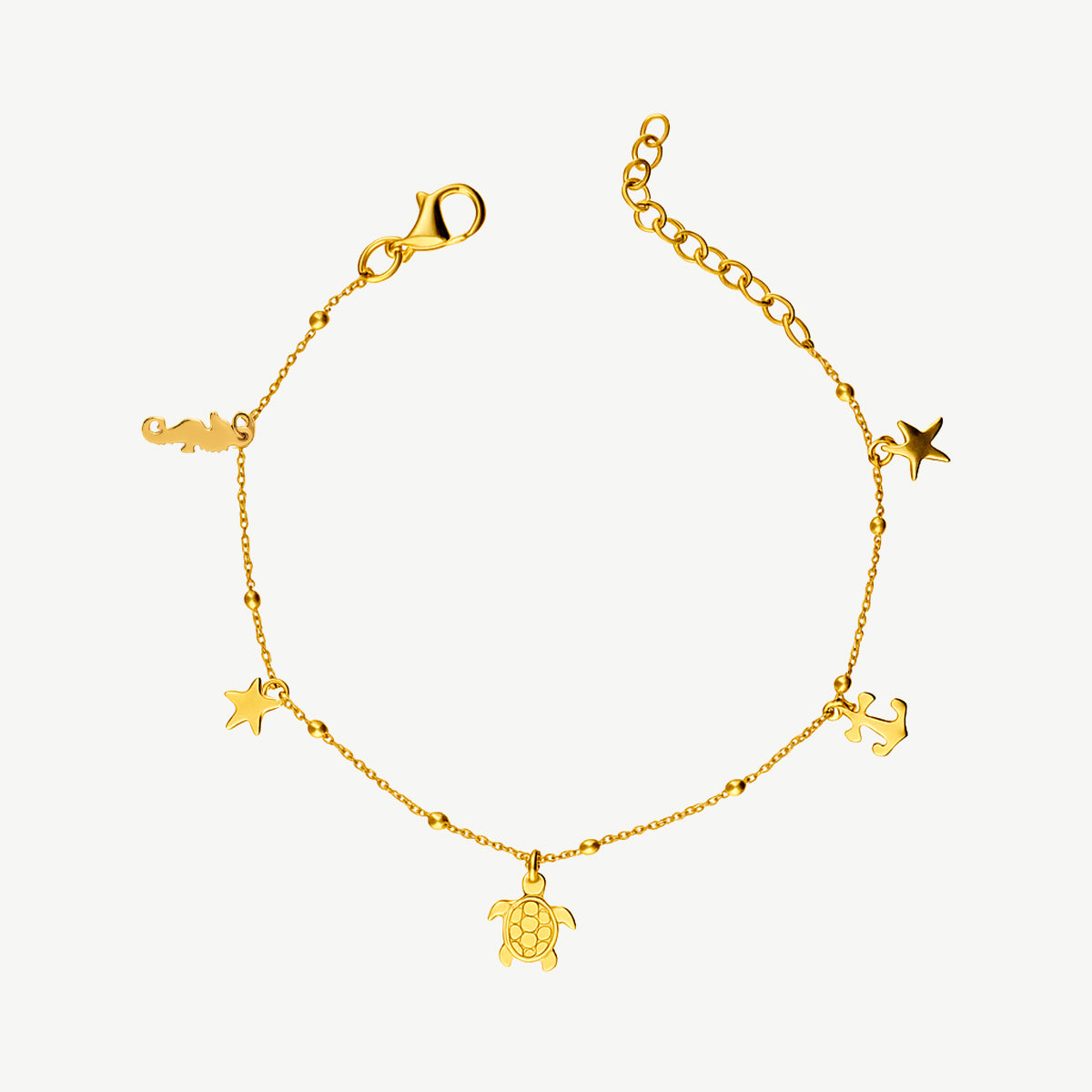 Il bracciale Fabiani in argento 925 dorato celebra il fascino del mare con una catena sottile decorata da ciondoli marini: stella, cavalluccio, tartaruga e ancora.