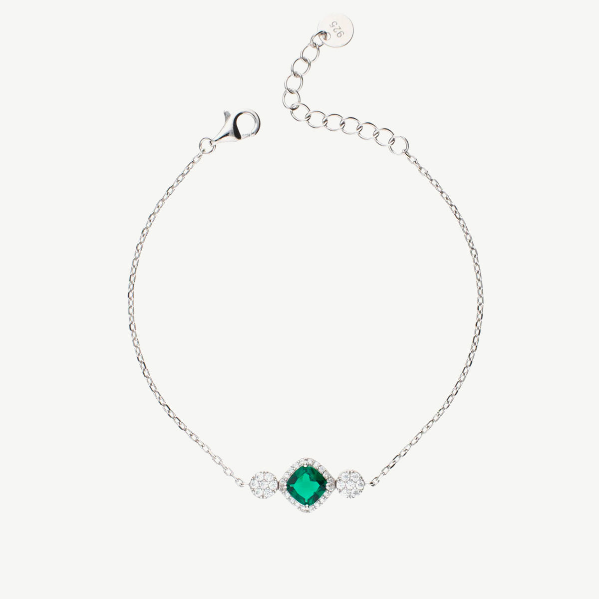 Al centro del bracciale spicca uno zircone verde con montatura a griffe, valorizzato da una cornice di pavé di zirconi bianchi taglio brillante che ne esalta la luminosità. L’elemento centrale ha un diametro di circa 0,8 cm, creando un punto luce importante ma equilibrato.