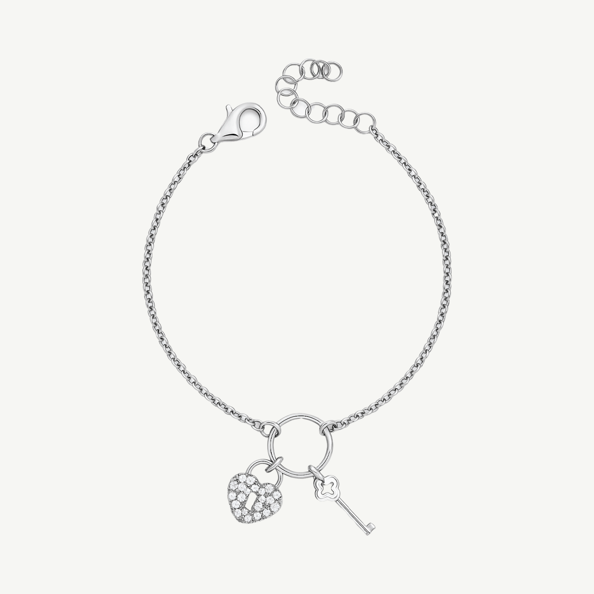 Il bracciale Fabiani in argento 925 è un gioiello simbolico e raffinato, impreziosito da due charm pendenti: un cuore pavé di zirconi bianchi e una chiave lucida. Un design elegante e romantico che rappresenta l’unione perfetta tra amore e libertà.