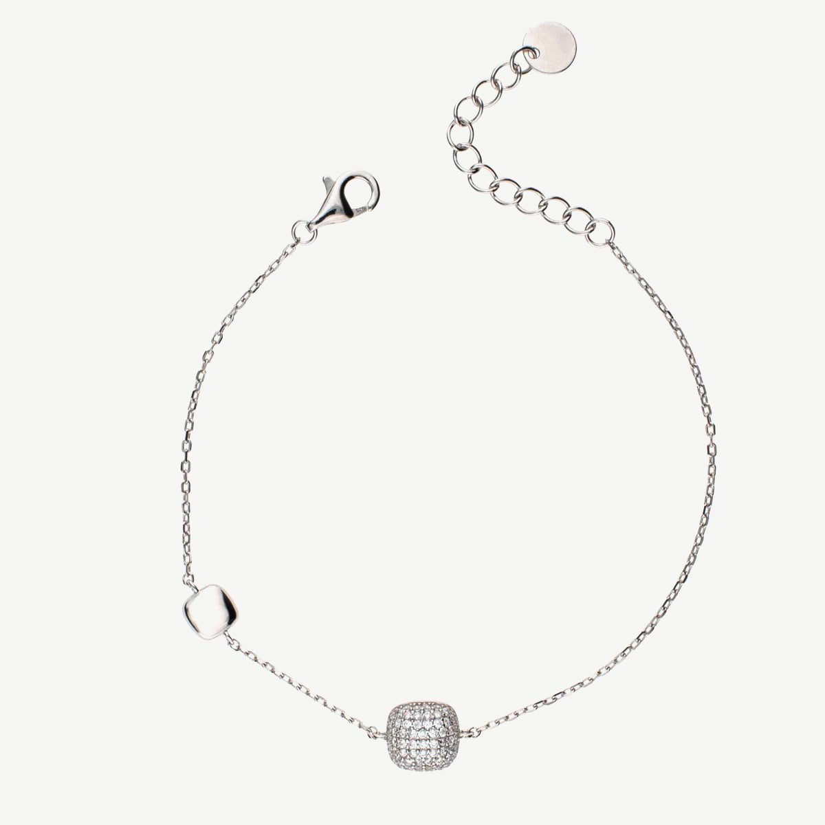Il design minimal è impreziosito da due elementi quadrati che creano un raffinato gioco di contrasti. Il primo quadrato, con diametro di circa 0,6 cm, è completamente ricoperto da un pavé di zirconi bianchi taglio brillante, che catturano la luce regalando un effetto luminoso e sofisticato. Il secondo quadrato, di circa 0,4 cm, presenta una superficie liscia e lucida, perfetta per esaltare l’eleganza essenziale del gioiello.