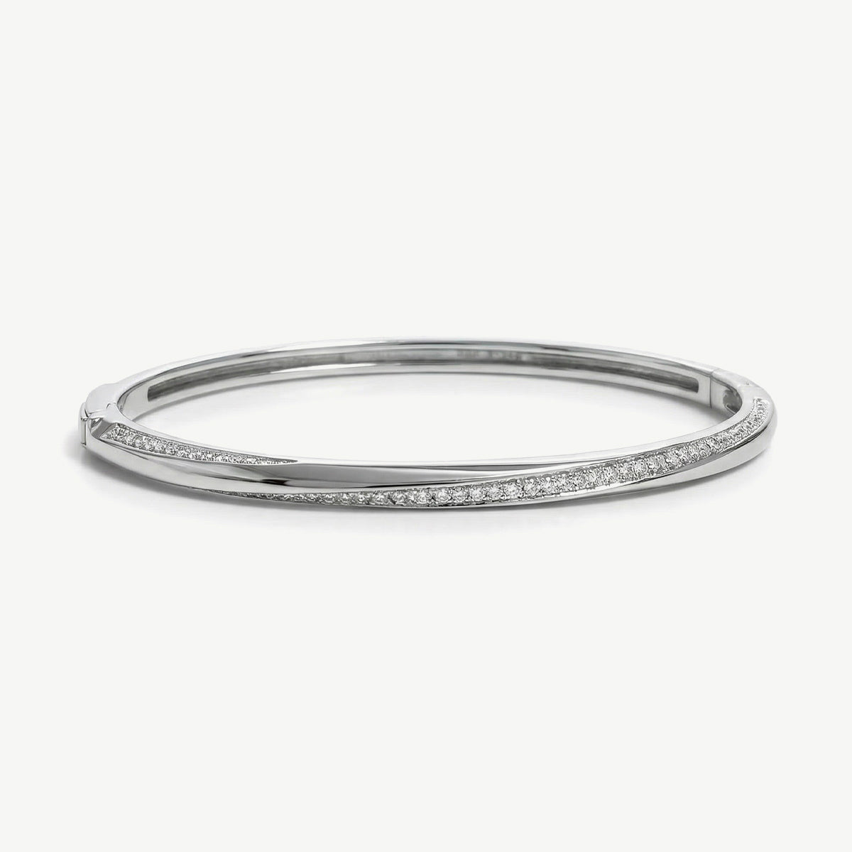 Il design rigido, dal diametro di circa 6,5 cm e con uno spessore di circa 0,3 cm, dona struttura e carattere mantenendo una linea essenziale e femminile. La parte superiore del bracciale è impreziosita da raffinate strisce con pavé di zirconi bianchi taglio brillante, incastonati con precisione per creare un effetto scintillante che cattura la luce ad ogni movimento.