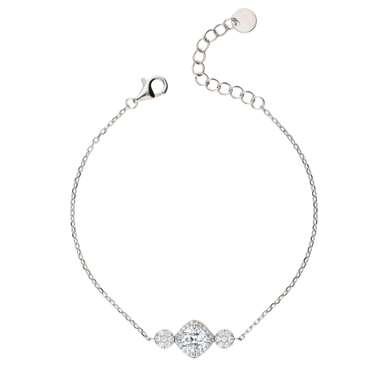 Il bracciale Fabiani della collezione Fantasia è un gioiello raffinato realizzato con una catena sottile in argento 925 e un elegante motivo centrale con zirconi bianchi.
