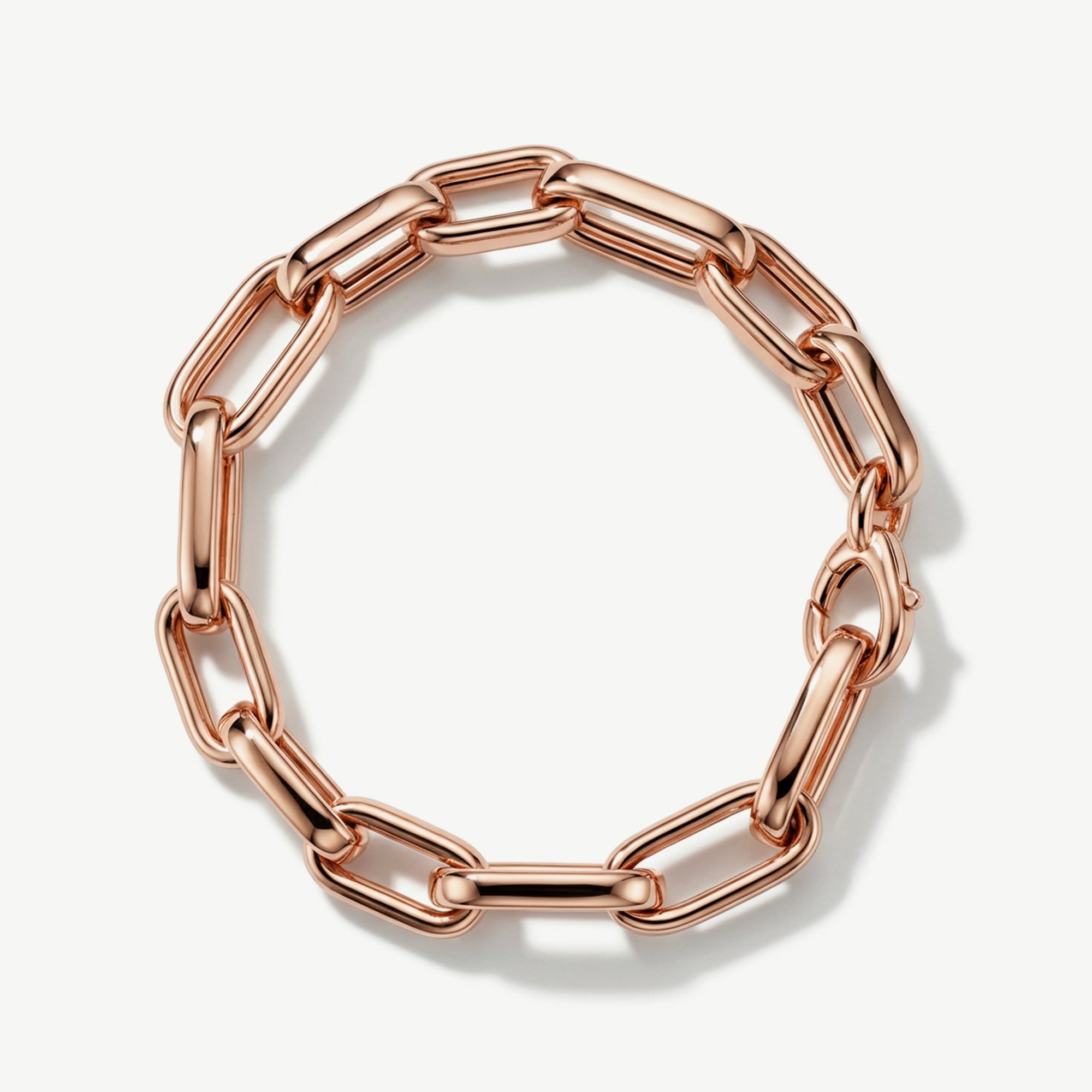 L’oro rosa, caldo e sofisticato, esalta la purezza delle superfici lucidate, restituendo riflessi delicati che valorizzano ogni movimento del polso. La chiusura a moschettone, solida e discreta, garantisce sicurezza e comfort, integrandosi perfettamente nel design come elemento funzionale ma mai invasivo.