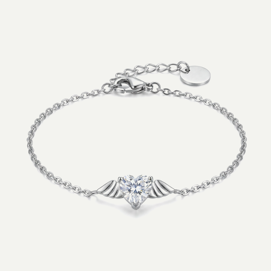 Bracciale Meridien realizzato in acciaio inox 316L, lucido, resistente e anallergico. Al centro del gioiello brilla un cuore di zircone taglio brillante, impreziosito da due piccole ali laterali che simboleggiano protezione, libertà e amore puro.