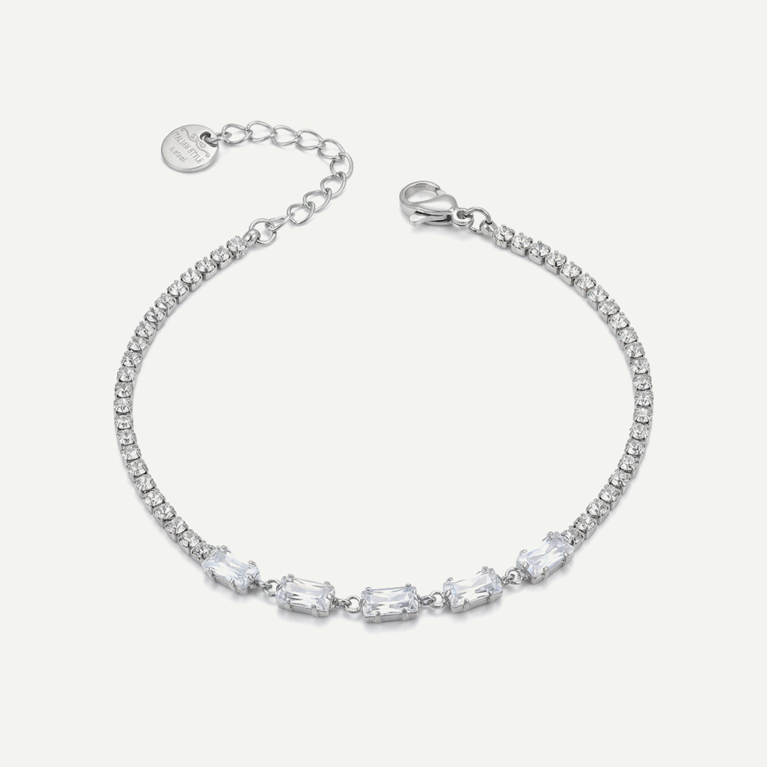 Il bracciale tennis Meridien con cristalli bianchi taglio baguette è un gioiello elegante e luminoso, pensato per chi ama uno stile raffinato e senza tempo.