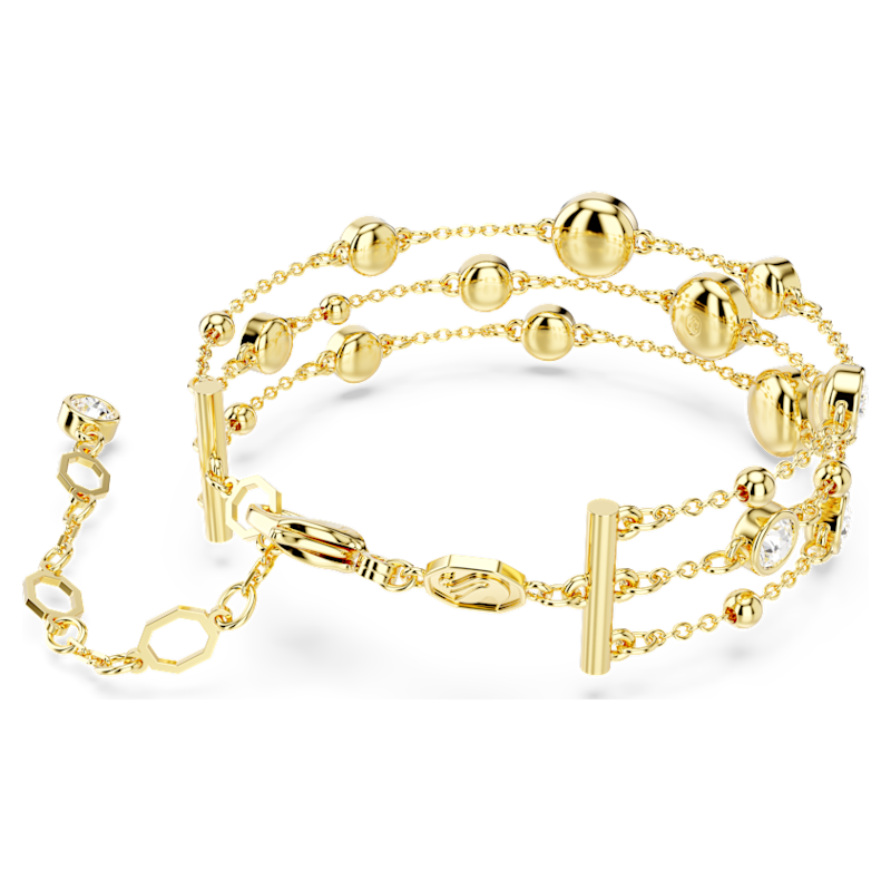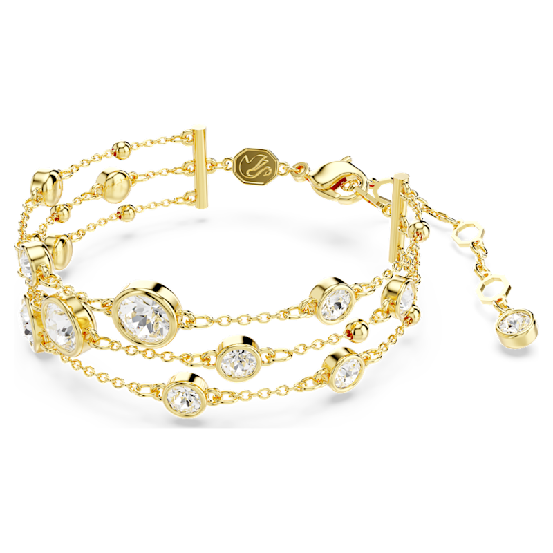 Con il suo triplo cerchio di radiosi cristalli, questo bracciale Imber avvolgerà completamente il tuo polso in una lucente bellezza. Il design placcato color oro presenta tre delicate catene, ciascuna impreziosita da gocce in metallo e da una serie di cristalli taglio Round incastonati in una tondeggiante montatura a castone. Completato da una chiusura con gancio a moschettone, questo gioiello è la scelta perfetta per uno styling luminosissimo.