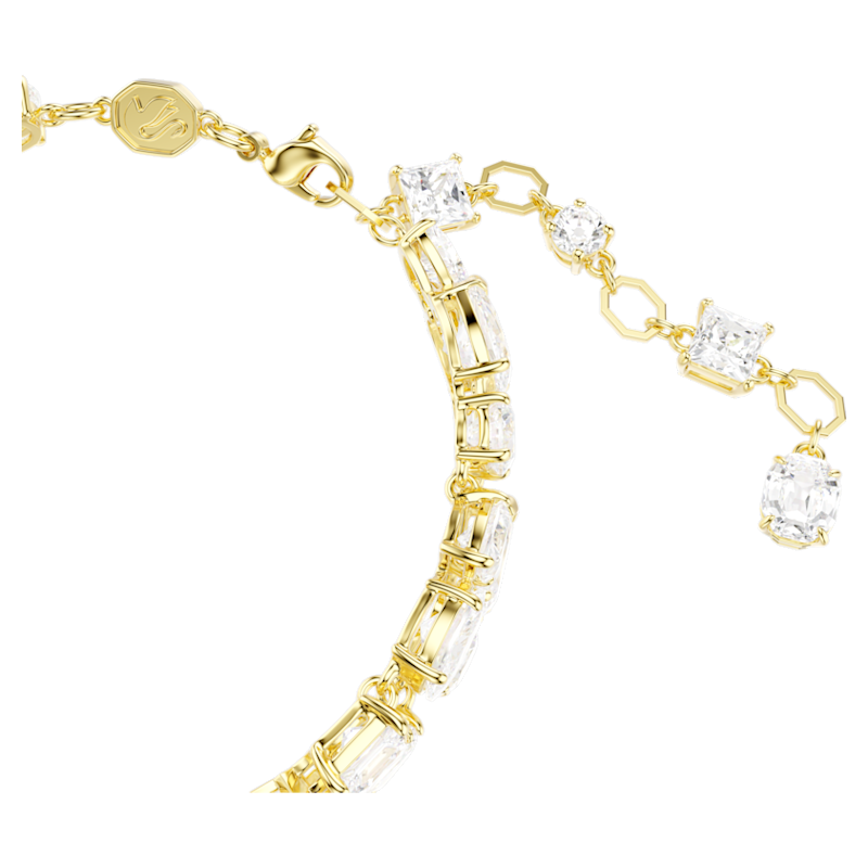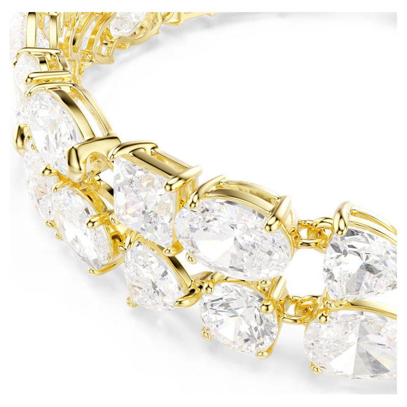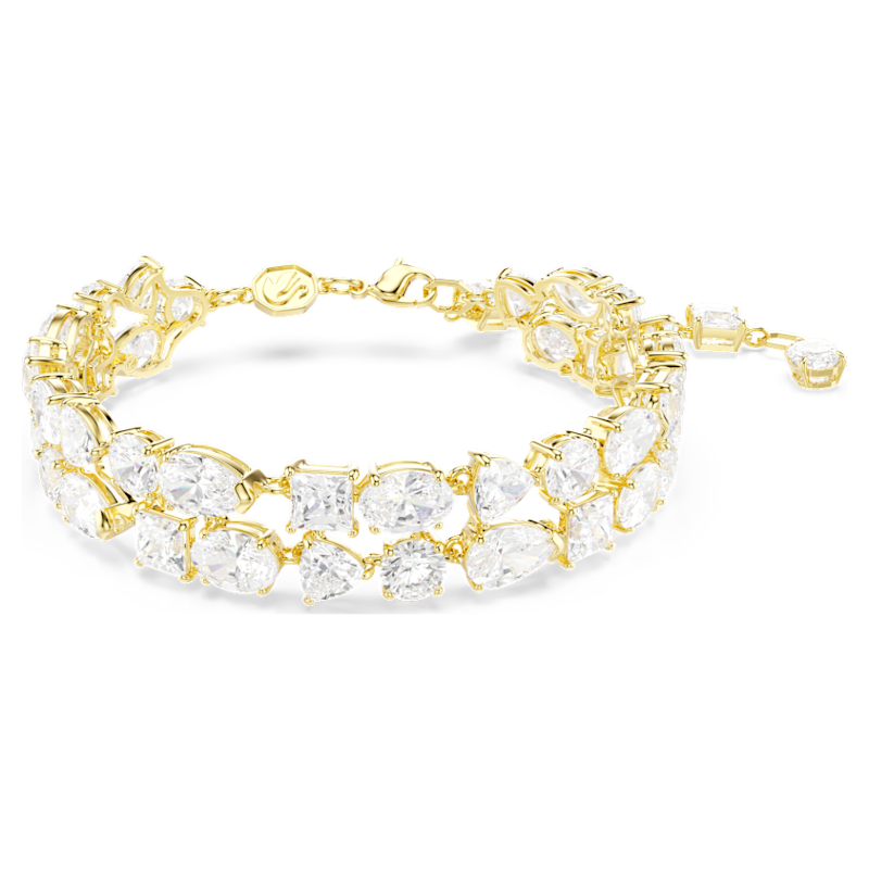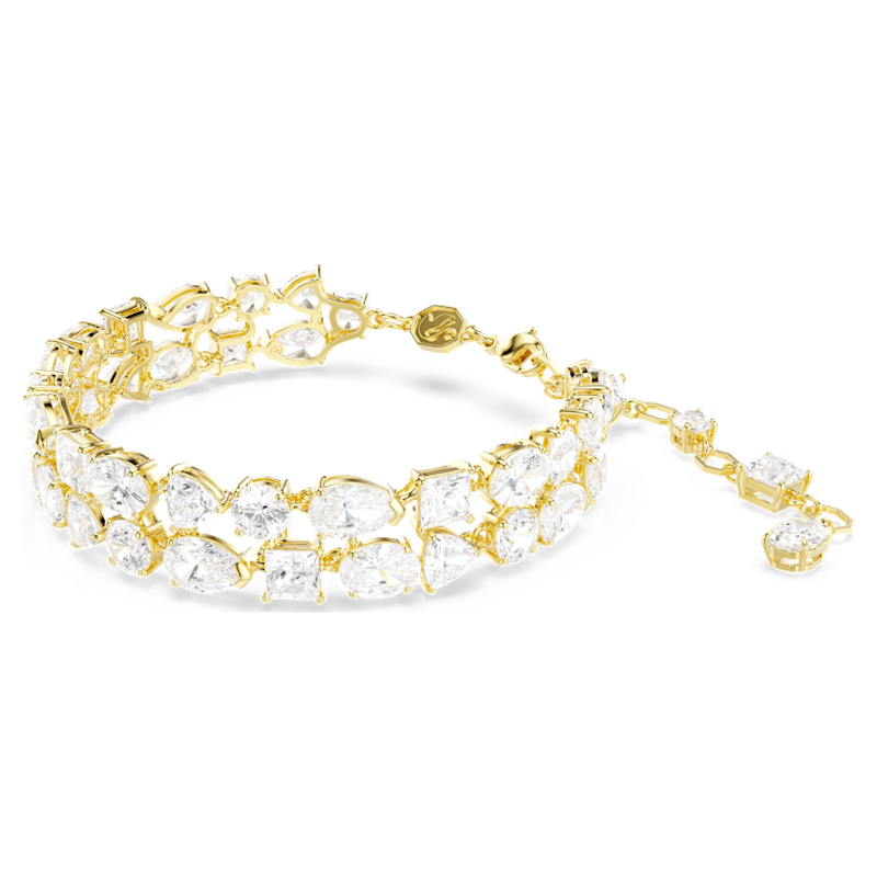 Rendi questo straordinario bracciale a doppio filo uno dei punti forte della tua collezione di gioielli. Il design placcato in tonalità oro combina un radioso gruppo di Swarovski Zirconia montate a griffe in un suggestivo mix di tagli e rifinito con un gancio a moschettone. Per un tocco di lusso extra, l’elemento allungato pendente presenta una serie di Swarovski Zirconia. Pura eleganza per il tuo stile da sera, o uno splendido dono per una persona cara.