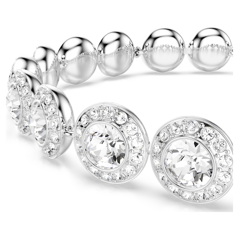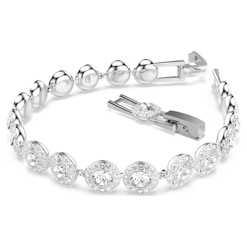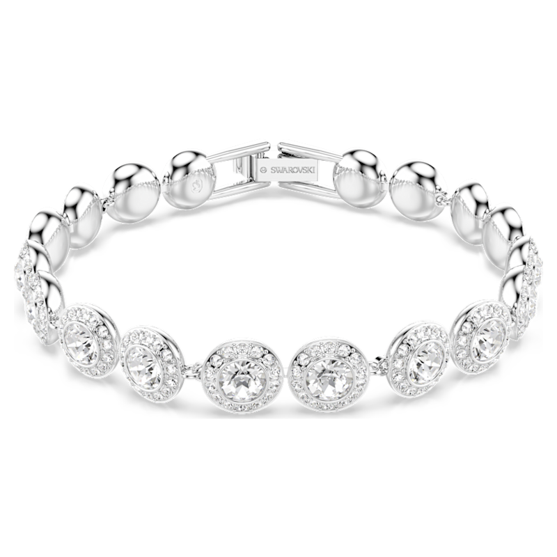 Avvolgi il tuo polso di luce con questo luminoso bracciale Una Angelic. Il design, placcato rodio, presenta singole maglie nel centro di ognuna delle quali è incastonato un brillante cristallo incorniciato da un alone di cristalli più piccoli di taglio Round. Una scelta di eterea eleganza, perfetta da abbinare a gioielli coordinati della stessa famiglia.