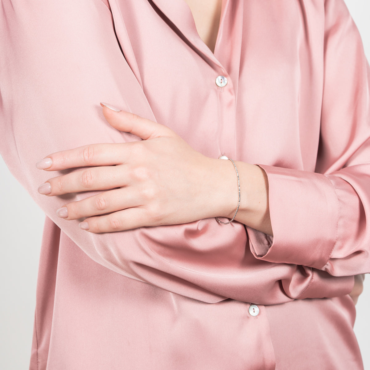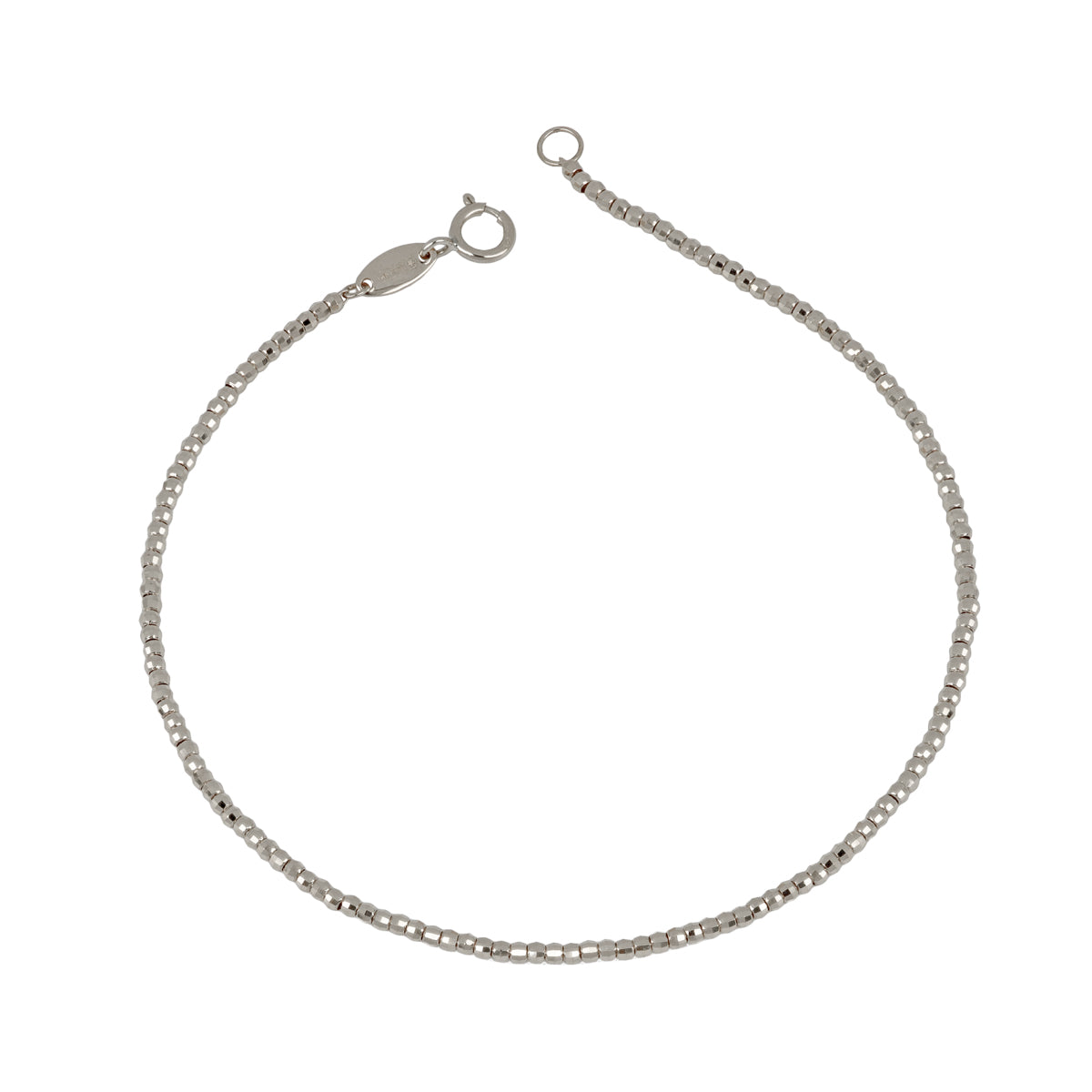 Bracciale in oro bianco 9Kt a sfere diamantate. Lunghezza 18,5 cm circa e chiusura a moschettone.