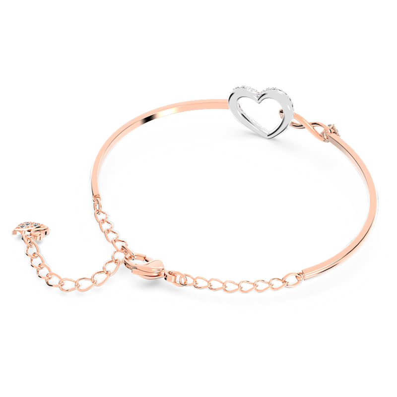 Un simbolo di amore infinito: Questo elegante bangle Swarovski mette in risalto i simboli di amore ed eternità intrecciati tra loro. Decorato con cristalli Swarovski bianchi, il motivo a forma di cuore completa alla perfezione il simbolo dell’infinito, per un look davvero romantico. Un mix di placcature del metallo bilancia alla perfezione tonalità calde e fredde, per completare il design. È una meravigliosa idea regalo (e una promessa) per una persona speciale.