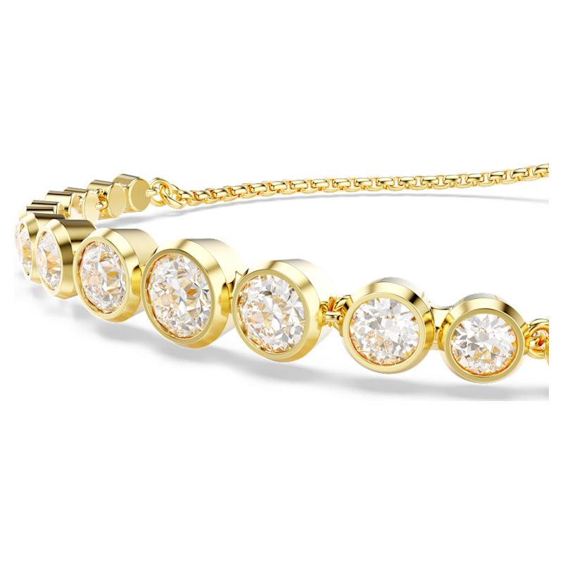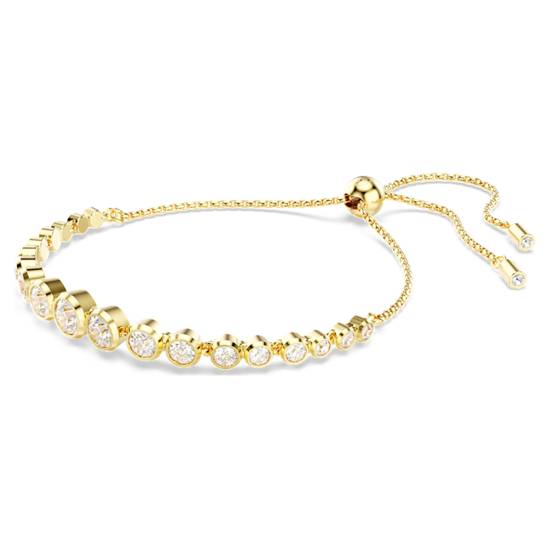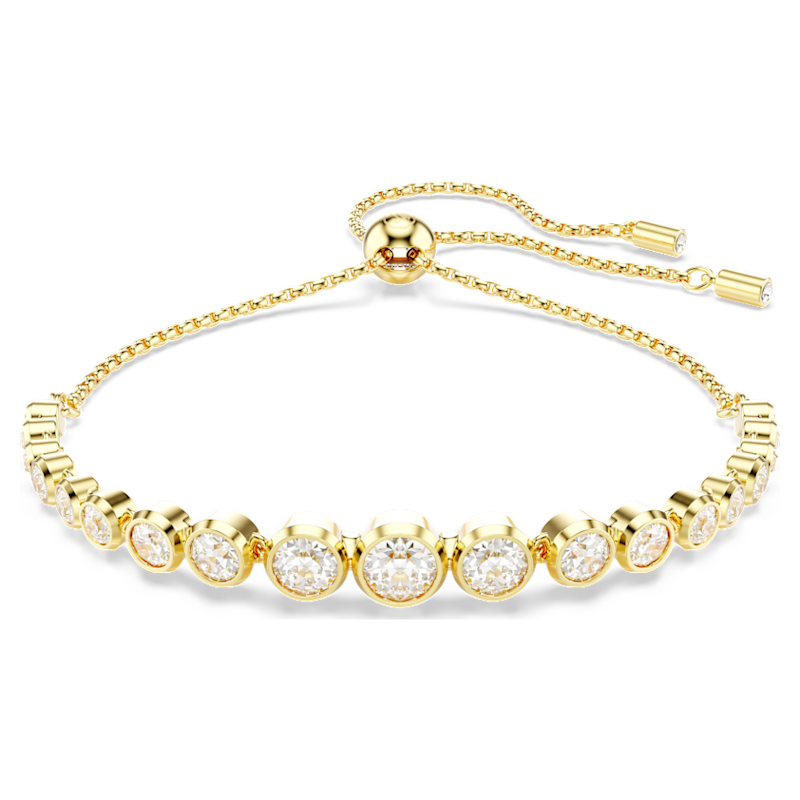 Perfetto per un’eleganza da tutti i giorni, questo bracciale placcato in tonalità oro incarna la semplicità della famiglia Imber. Il design presenta una gradazione di cristalli Cry taglio Round, ognuno incastonato in una moderna montatura a castone su una delicata catena, con una chiusura scorrevole per indossarlo facilmente. Ogni delicata goccia dona un tocco di sofisticata luminosità al polso, rendendolo un gioiello passepartout da sovrapporre con altre creazioni per un effetto giocoso.