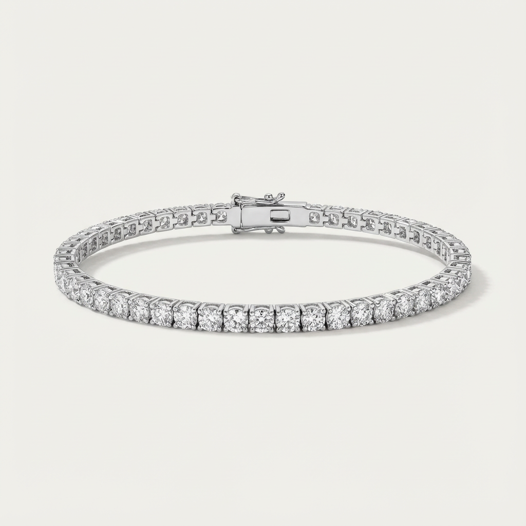 Raffinato, luminoso e intramontabile, il bracciale tennis del brand MONAÉ è realizzato in argento 925 e impreziosito da moissanite per un totale di 5,7 carati, colore D, con certificazione GRA.