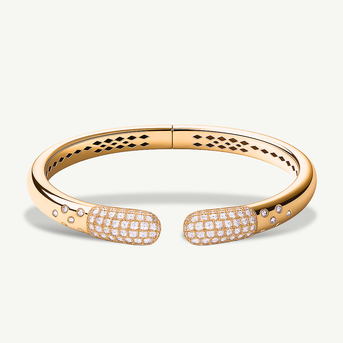 Il bracciale rigido in oro rosa 18Kt è caratterizzato da terminali bombati pavé di diamanti taglio brillante, per una caratura complessiva di 0,76ct.