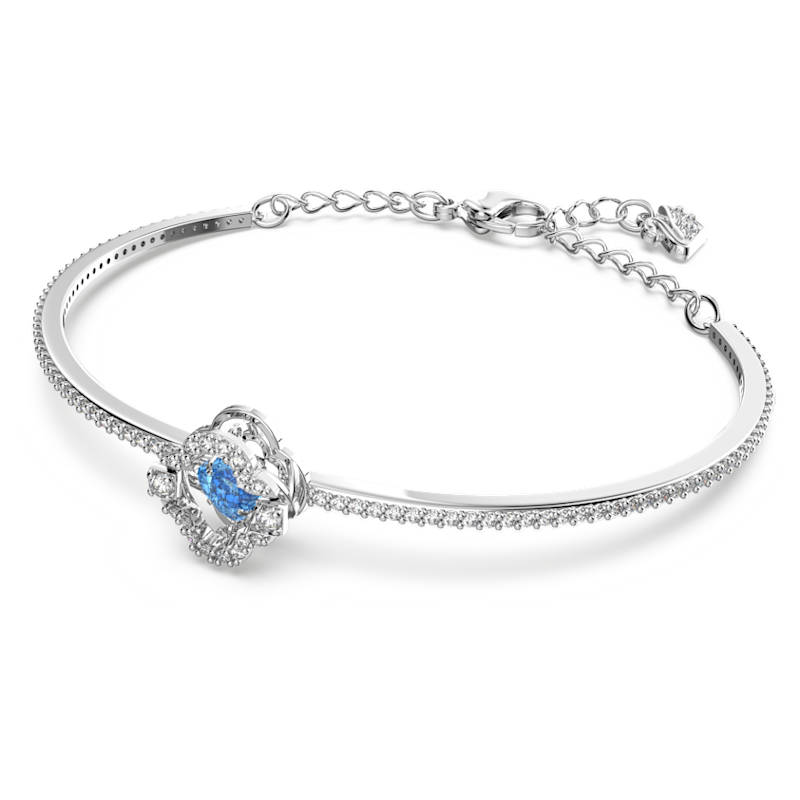 Questo incantevole bracciale rigido dona un tocco di eleganza al quadrifoglio portafortuna. Presenta un cristallo color acquamarina circondato da brillante pavé su un’elegante montatura placcata rodio. Indossalo con un outfit da giorno o da sera: tutto è concesso.
