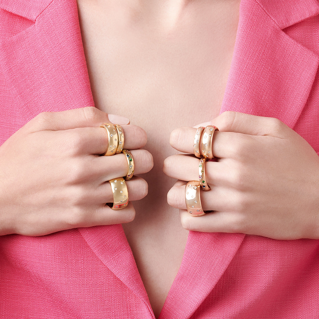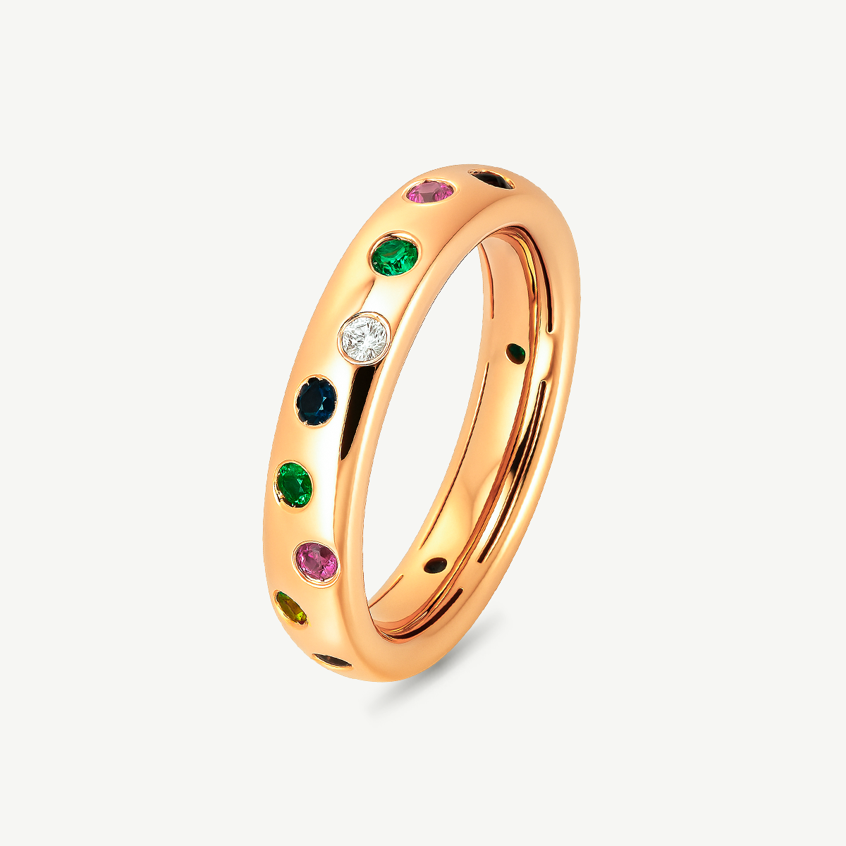 Anello a fascia in oro rosa 18Kt con diamanti taglio brillante 0,03Ct e zaffiri per una caratura complessiva di 0,50Ct.