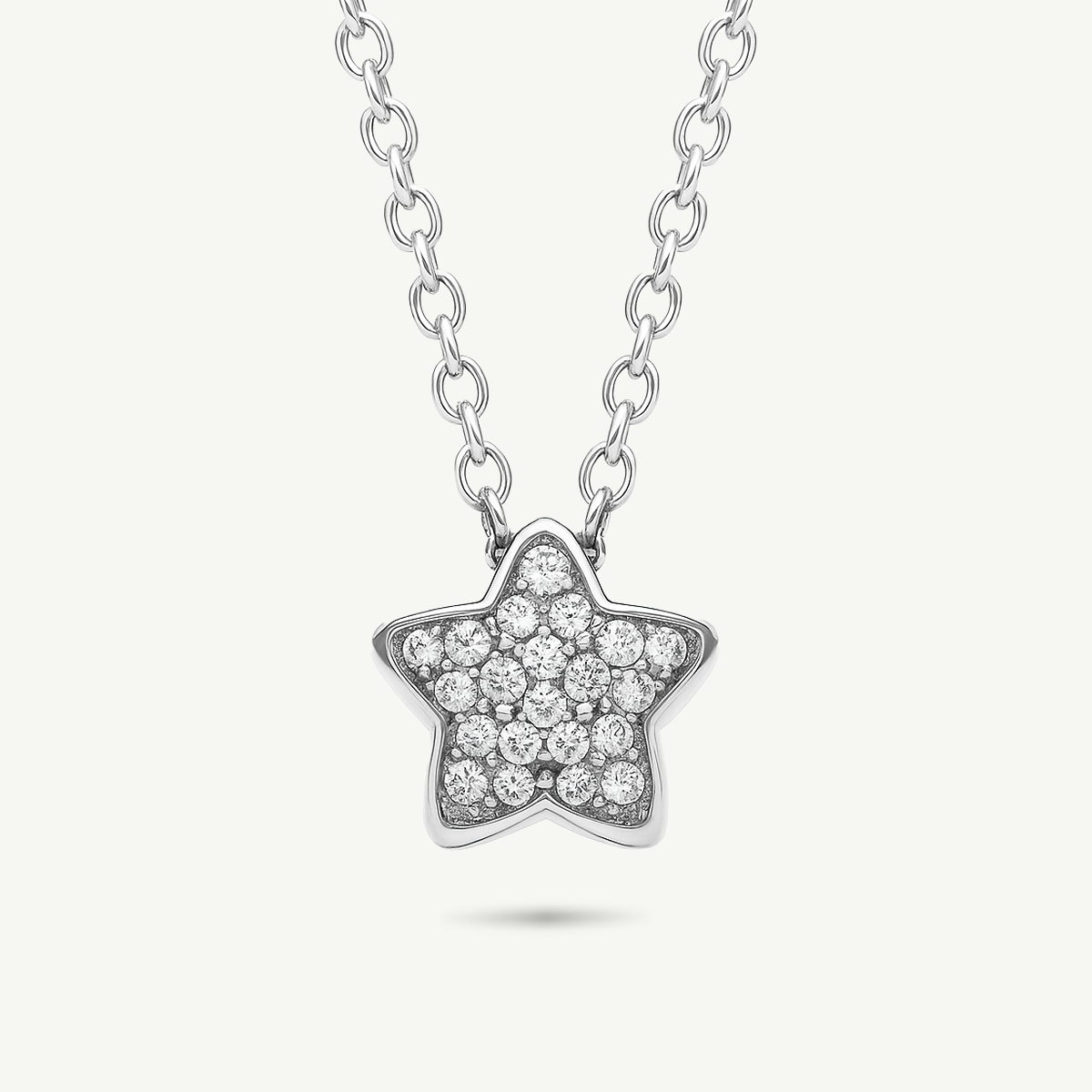 Anello a stella in oro bianco 18Kt con diamanti taglio brillante per una caratura complessiva di 0,11 carati. Lunghezza 42 cm circa e chiusura a moschettone.