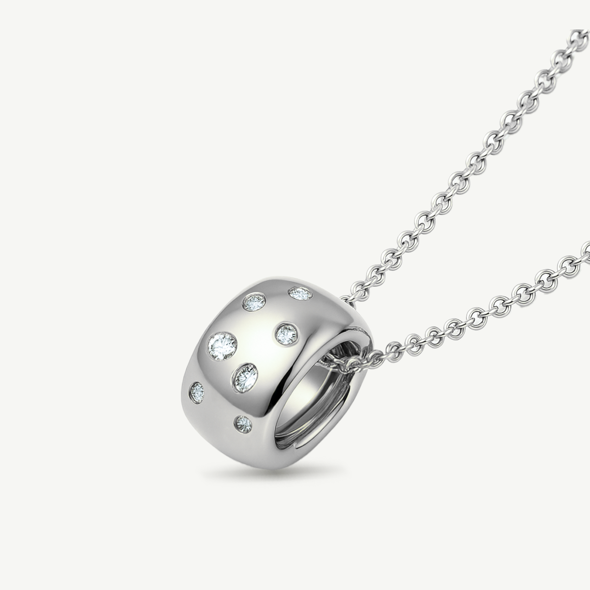 La collana Bubble con pendente in oro bianco e diamanti incarna la filosofia della collezione: forme gonfiate e volumi morbidi che riflettono la luce in modo naturale.