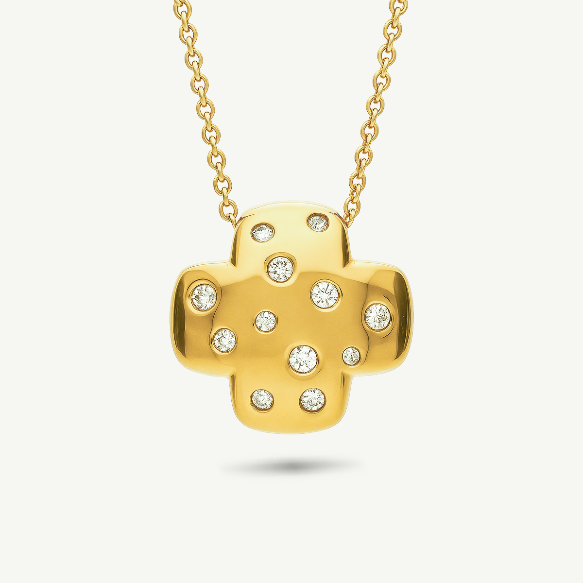 La collana Bubble con croce in oro giallo e diamanti racchiude tutta la filosofia della collezione: volumi morbidi, linee pure e luminosità naturale.