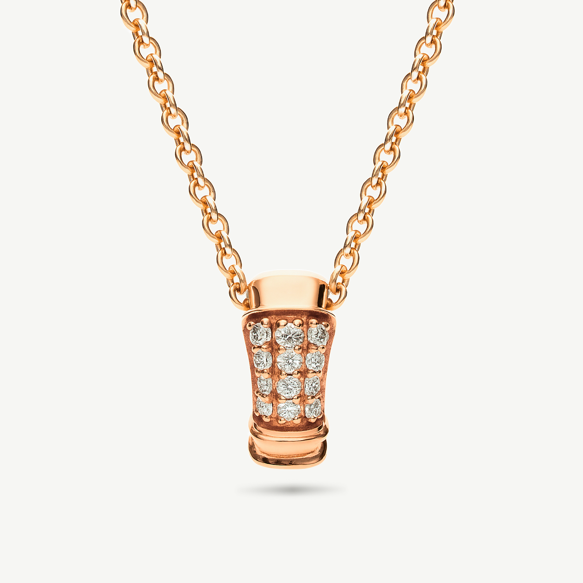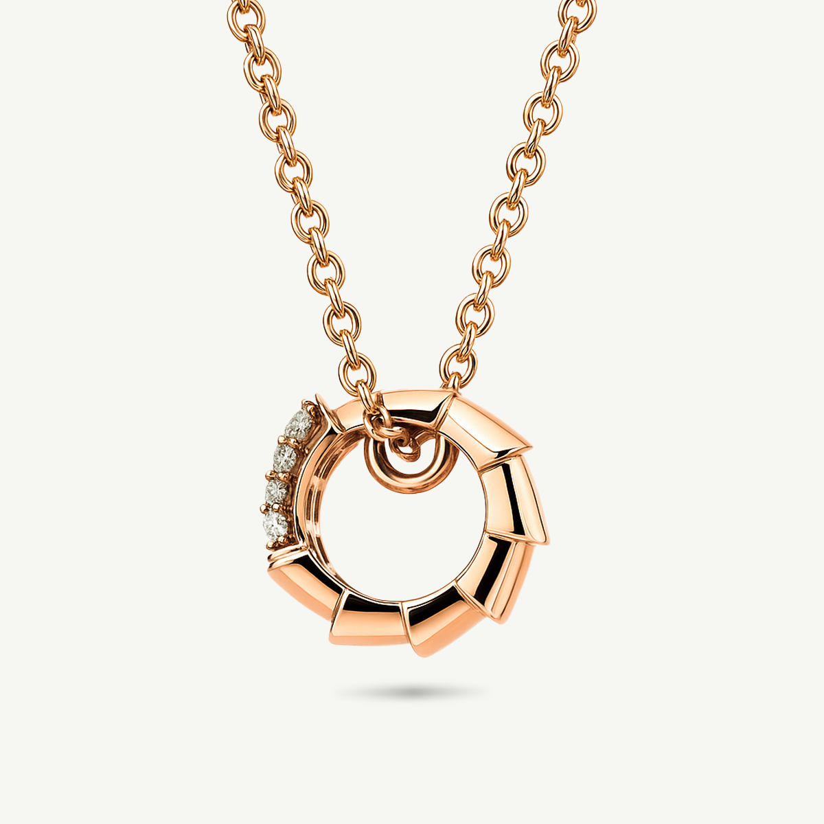 Girocollo a maglia rolò in oro rosa 18Kt e ciondolo serpente con diamanti taglio brillante per una caratura complessiva di 0,12Ct. Lunghezza 45 cm circa e chiusura a moschettone regolabile.
