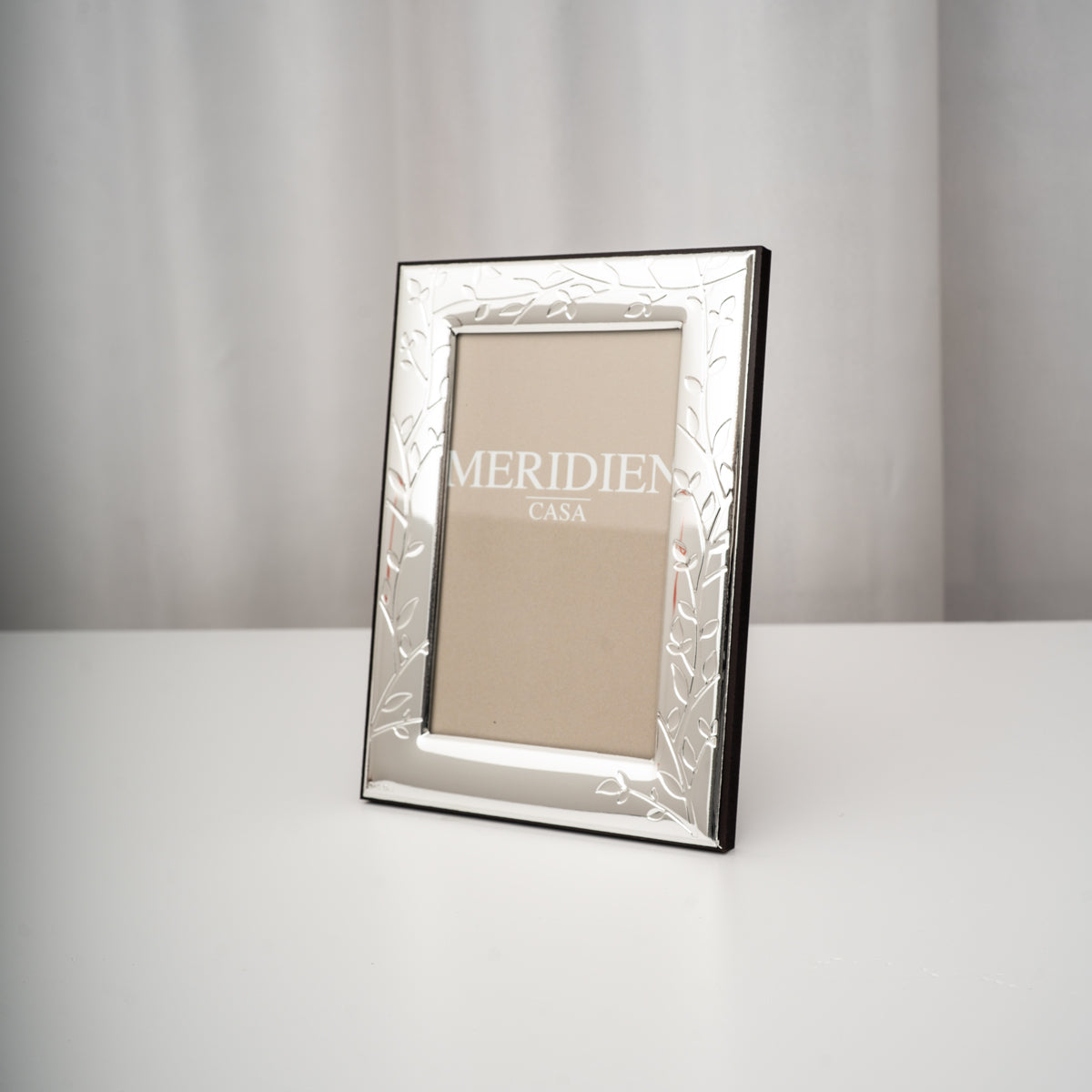 La cornice portafoto 9x13 Meridien è un elegante accessorio d’arredo caratterizzato da un raffinato decoro a rilievo con motivi di rami e foglie che impreziosiscono il suo profilo lucido argentato. La superficie riflettente cattura la luce con delicatezza, donando brillantezza e armonia all’ambiente in cui viene esposta.