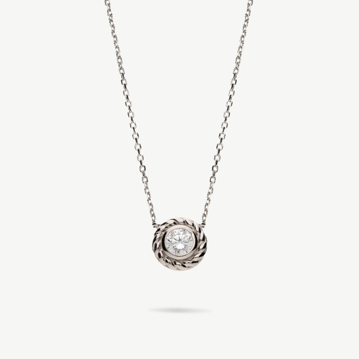 La collana Fabiani in argento 925 rodiato si distingue per il suo pendente a punto luce con montatura intrecciata, che avvolge uno zircone bianco taglio brillante.